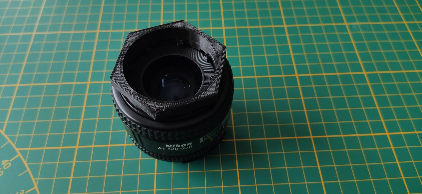 None of the standard tools for unscrewing rings were able to loosen this ring. At first, I 3D-printed a simple ring with a diameter small enough to fit inside the lens. I warmed the part of the front barrel a bit with a hair dryer, then pressed quite hard the lens onto the ring so that the thread would fall back into its proper position.