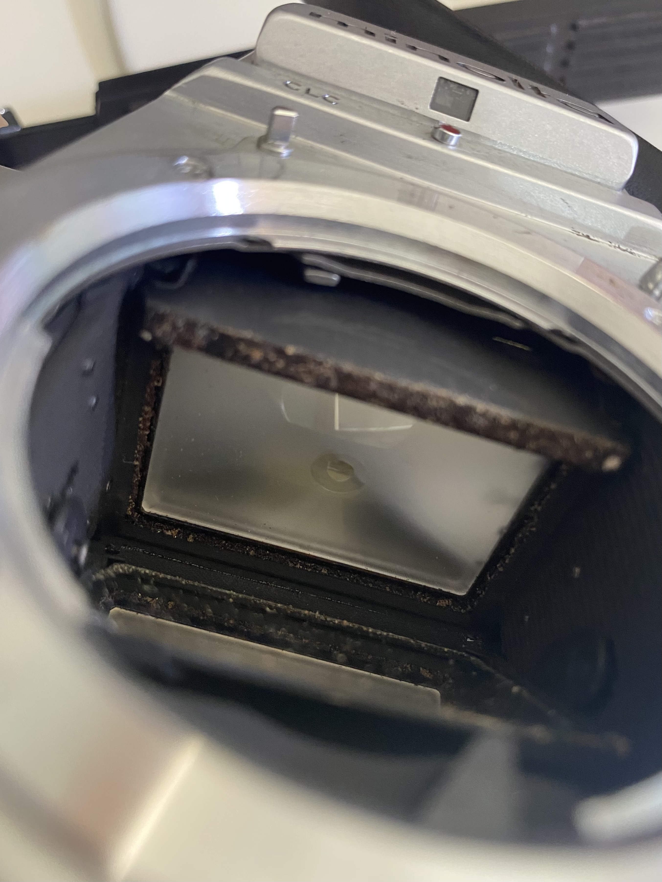 Before you clean it you need to remove the remnants of the old foam bumpers and replace with new ones. That junk on the mirror is from the disintegrating foams in the camera.