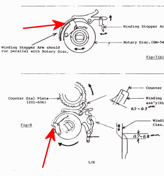 What irritates me is, those jams really only happens everytime when the brass part - it is called driving claw according the parts manual - is between winding stop arm and rotary disc when closing the door as you can see on the first image.