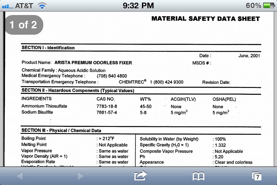 Bruce, your formula makes an alkaline fixer while wildbill's ingredients make a rather acidic fixer. Sodium bisulfite by itself is quite acidic and it is usually used together with sodium sulfite. Look (there was a url link here which no longer exists) for a popular recipe. Since sodium sulfite is not overly toxic there is a chance it doesn't show up on your msds.