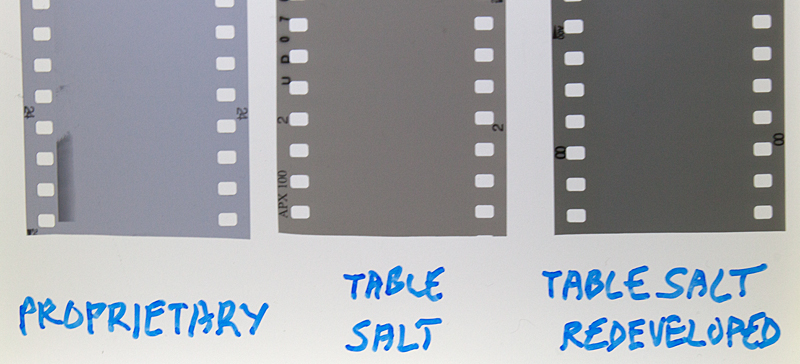 The print from the negative fixed in table salt solution is entirely satisfactory but held side by side with a print from the proprietary fixer negative it is slightly more grainy.