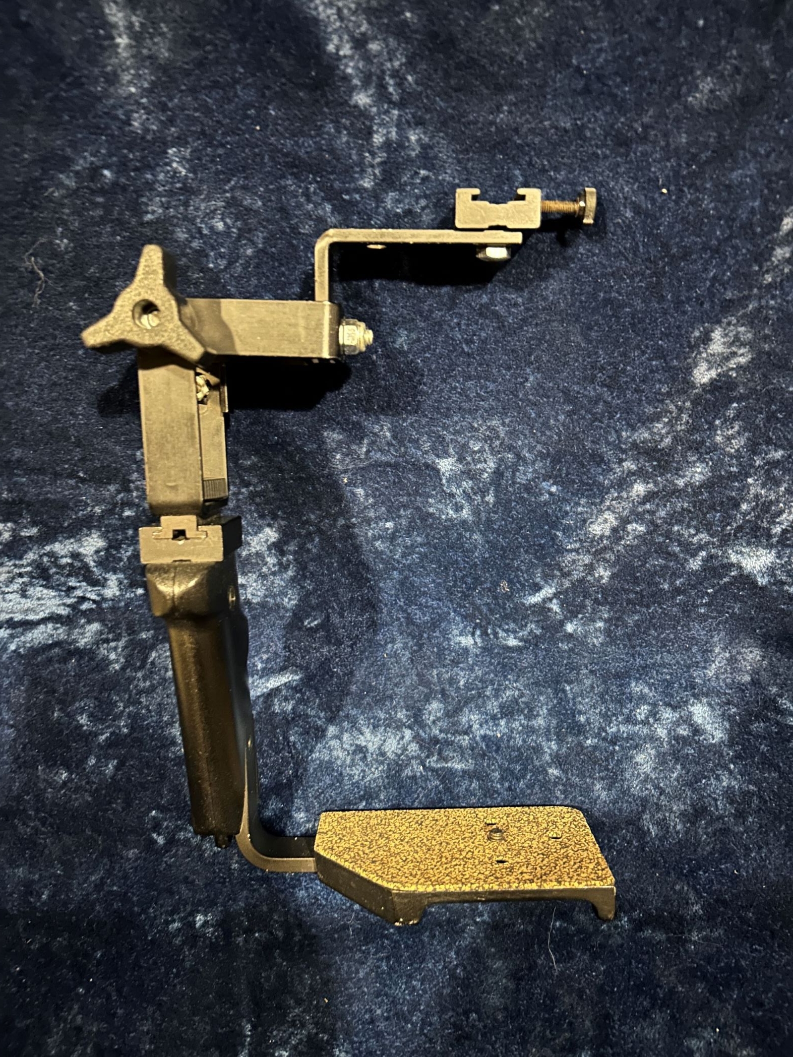 Flash bracket that flips to keep flash directly over the lens axis. Cold shoe. Base is suitable for 35mm or medium format; as well as dslr. Flash not included - I just wanted to demonstrate how it tilts.