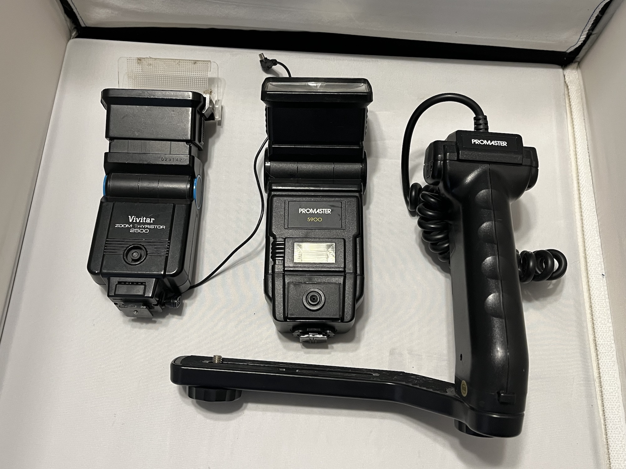 A pair of flashes: Promaster 5900 with Pentax auto module and off-camera battery pack/grip, and a simple old Vivitar 2500. $15 + shipping for the pair (please take both - buy one, get one free)