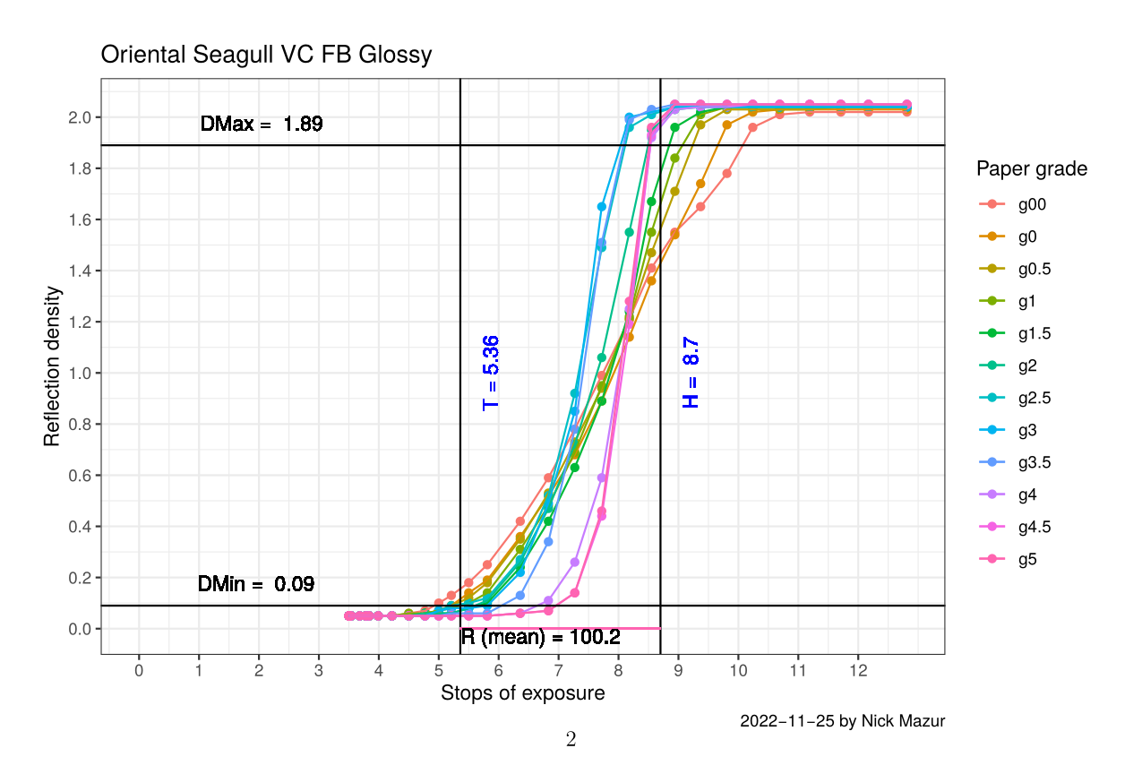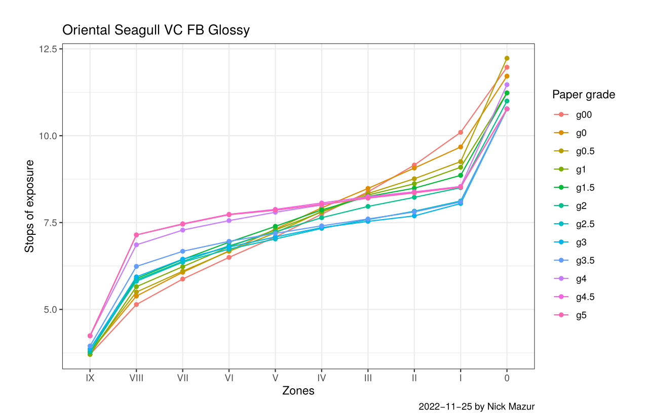 If one wants to work strictly within sensitometric theory, then the approach below is not ideal. However, if one wants to evaluate paper performance practically, then it works nicely, at least for me. I also want to point out that the goal here is to come up with paper grades empirically, rather than to comply with an a priori definition of paper grades. As far as I know, the ISO standard does not include paper grade definitions. Also, the 0.09 value comes from 0.04 over B+F, with the densitometer zeroed on the reflection plaque. You'll see that the Oriental Seagull VC FB Glossy does not have a perfectly linear response to Ilford's under the lens filters. This could be easily remedied by means of a dichroic enlarger head (or a modern LED-based system) and customized filtration, which my program helps figure out.