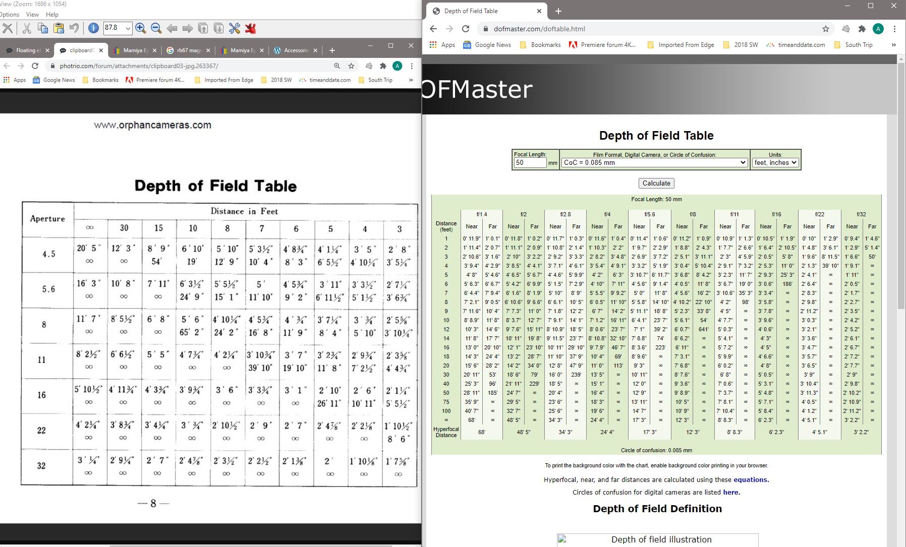 However, based on your comments of .035mmCOC for 16x20", I would need to add three stops. The chart on the right approximates the Mamiya furnished charts at .085. The one on the left is you recommended .035MM COC. It appears three stops smaller is required. Is that how you read it?