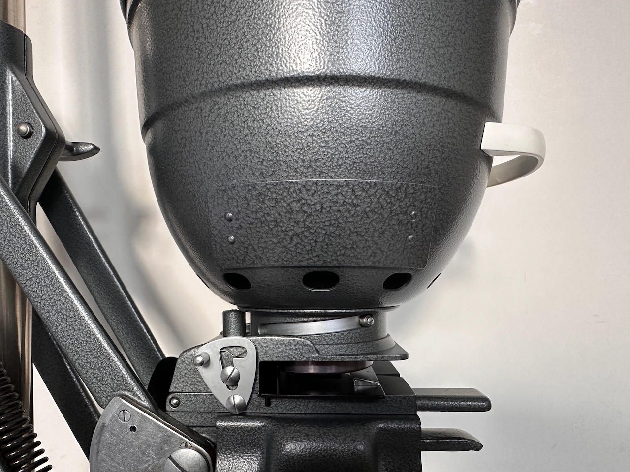 The locking easel has long T-slots milled on the underside which slip over the T-nut on the baseboard. Positioning the easel when composing the print, it can be locked down with the side lever. Its a terrific feature on these wonderful enlargers.