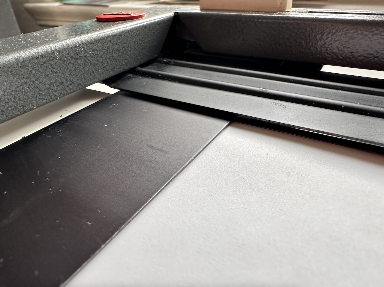 Also can't seem to figure out how to make that slim clamp (which holds the very top edge of the paper down) clamp nicely again (it goes down / "clamps" on the very left end, but kinda lags (stays above the baseboard / paper, doesn't clamp at all) the rest of the way 🤔