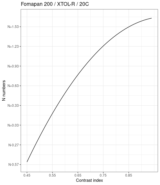 Here's a plot of N-development to CI (for a condenser enlarger), in which I am using the BTZS convention for establishing N-development, which should also be applicable to Zone System methodologies. Regardless of which convention we use, it's clear that contrast increases "normally" with increased development time with Fomapan 200. Click on the thumbnail for a larger view.