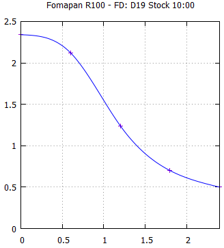 So, I went ahead and started processing my film. After 3' in bleach, I washed it and took a look inside. Surprisingly, it most definitely wasn't properly bleached, with a large band of unbleached silver in the middle of the frames. I put it back in for another 3', after which it seemed ok. In hindsight, I probably should have left it more. Foma's instructions from their permanganate based kit call for 8' bleaching, but I mixed them up with their 5' suggestion for a dichromate bleach. The rest of the process was completed and finally some observations could be made. First, the best shot was always the ISO100 one, without being necessarily perfect. It's quite good, but a bit less exposure would be nice, at EI125 or 160 (incidentally, dr5 suggests EI160 for this film and his process). Second, the Dmin is rather high. It's probably not as clear as could be. I need to do some testing on it and it could be caused by the short bleaching time. I used my Minolta Scan Dual III as a densitometer and this is the characteristic curve I got: