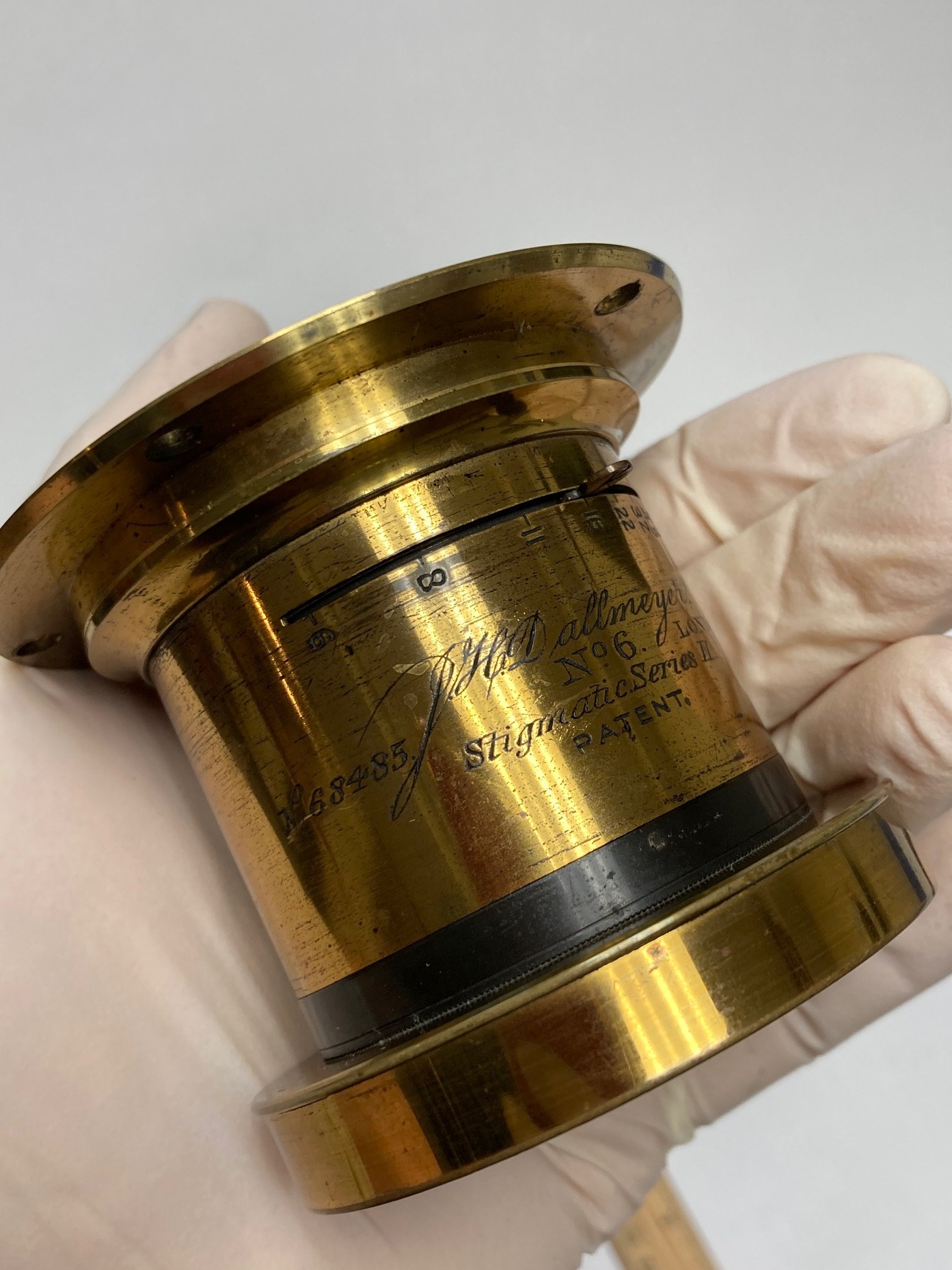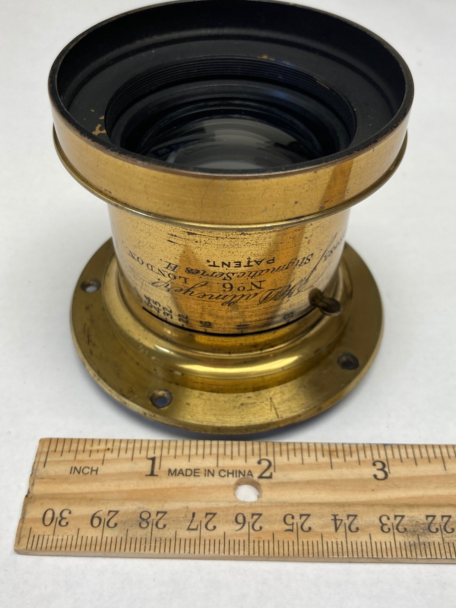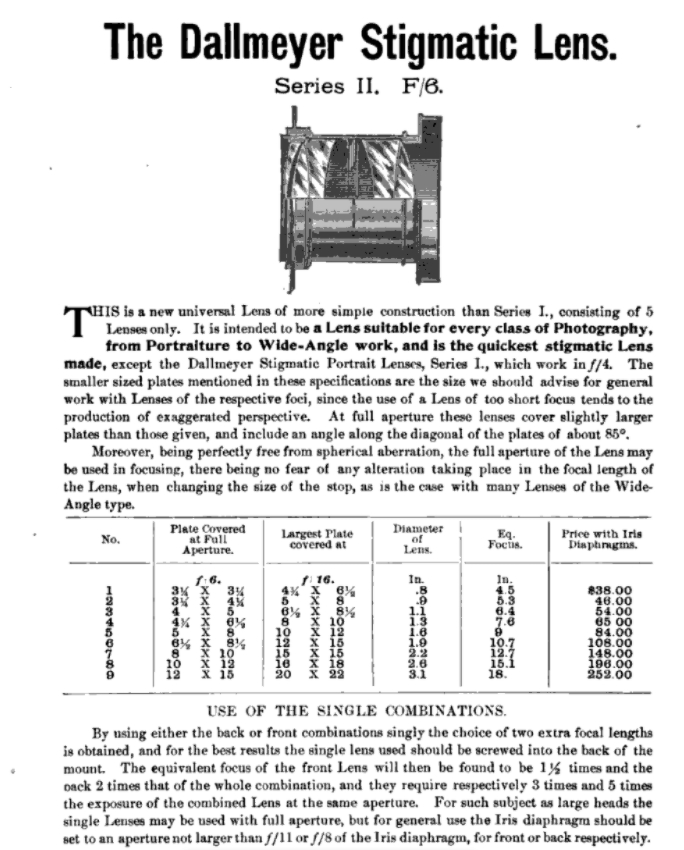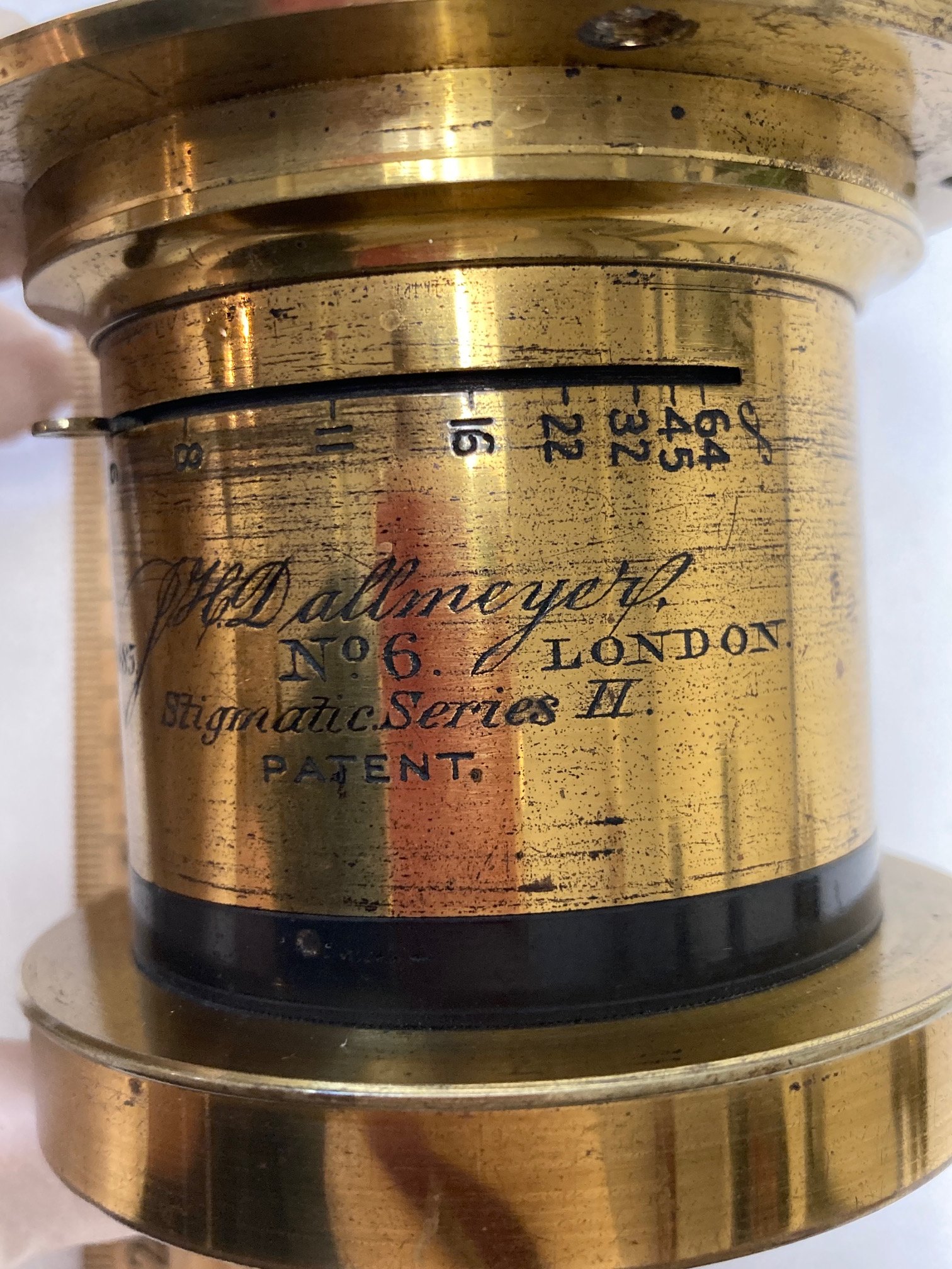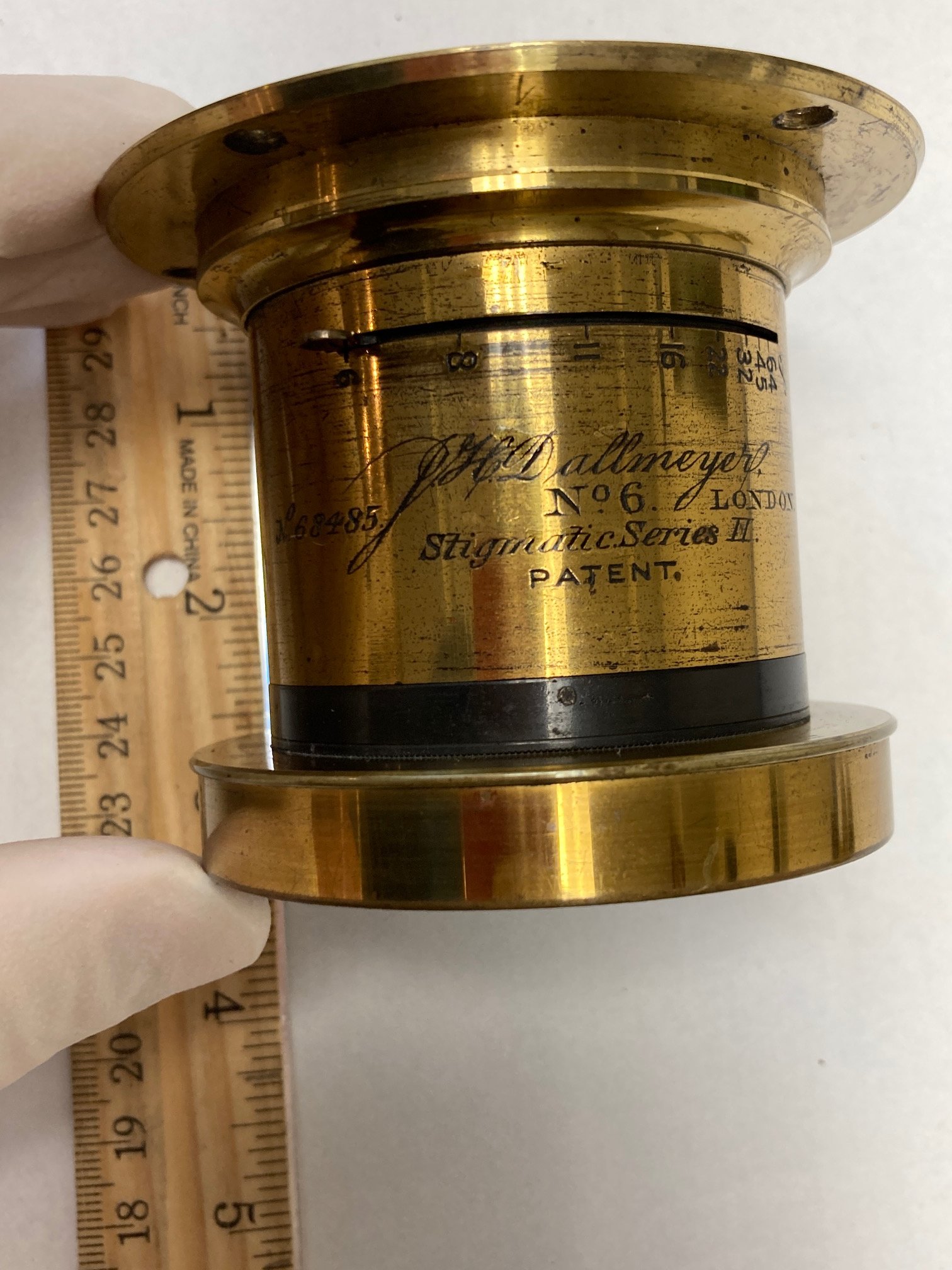 Dallmeyer Stigmatic II No 6. Lens. Dates to 1904. Will cover 12x15" stopped @ f/16 and will cover whole plate at f/6 (see advertisement). 10.7" Eq. Focus. This unique 5 element lens is also a "triple convertible" by using the either the whole lens, the front combination or the rear combination. See the full description at the bottom of the ad attached, but you have 10.7" Eq Focus with the whole lens, 16" with the front combination and 21.5" with the rear combination. You end up with an antique lens that can be modestly wide angle to modestly telephoto.