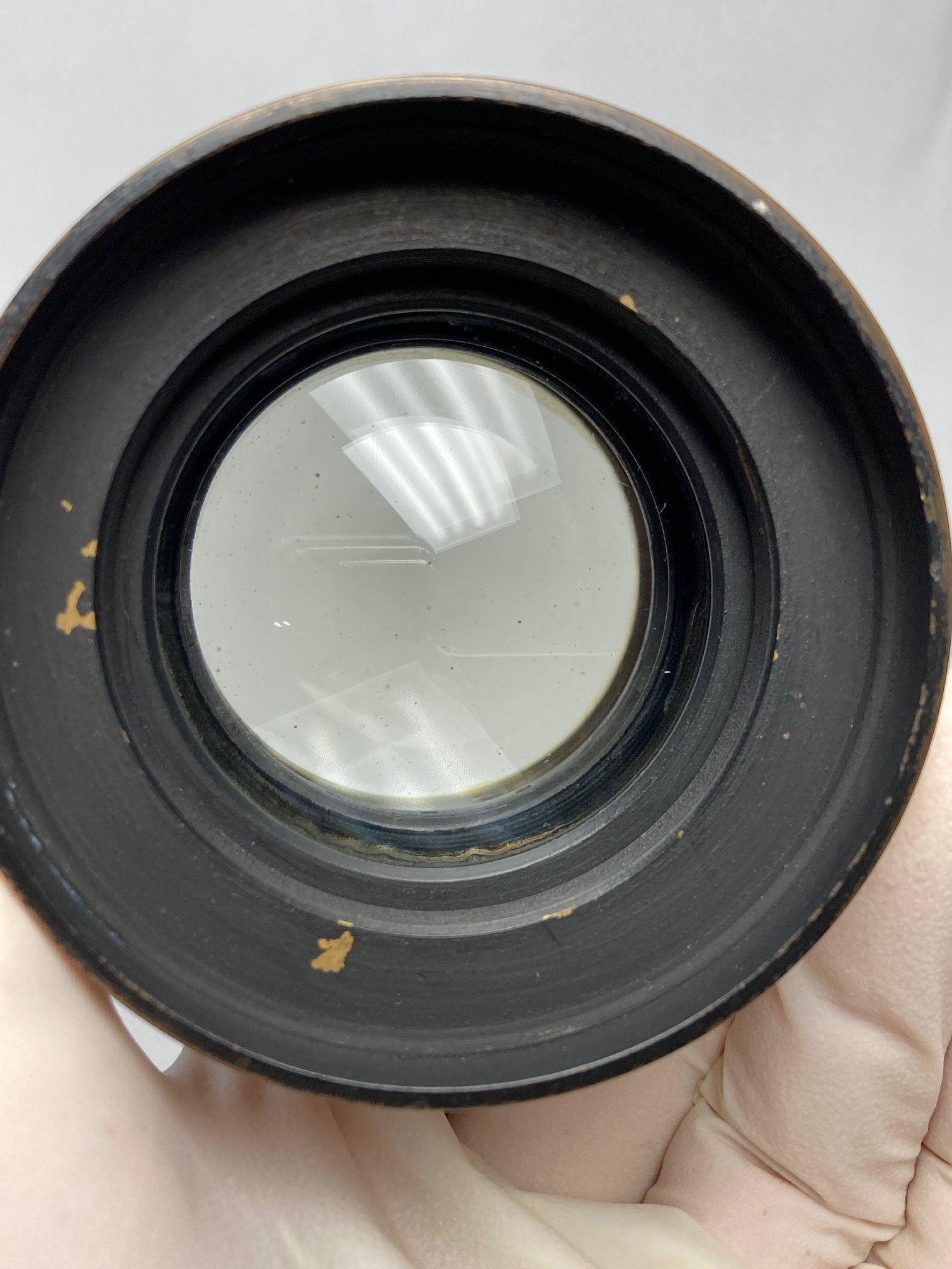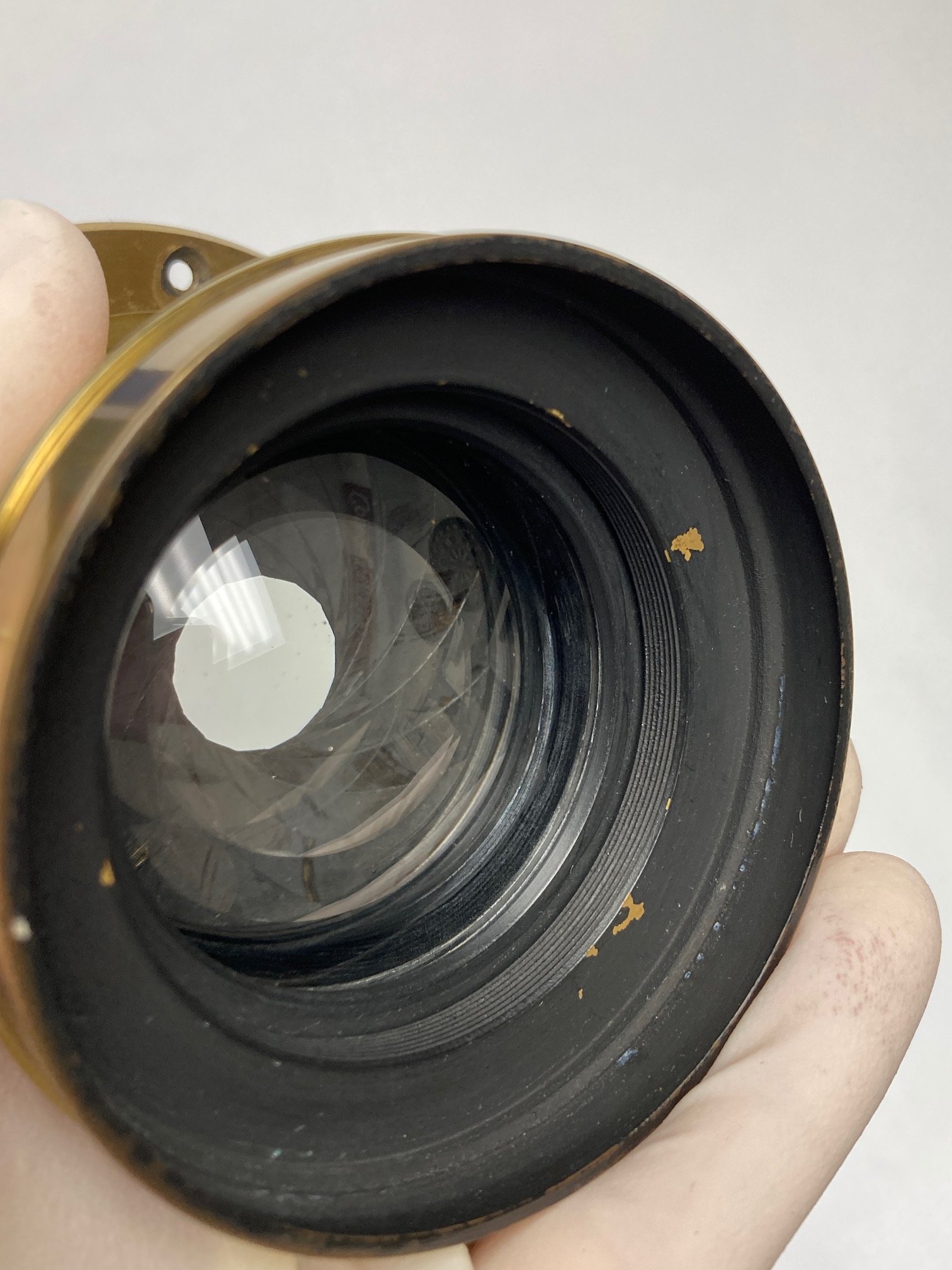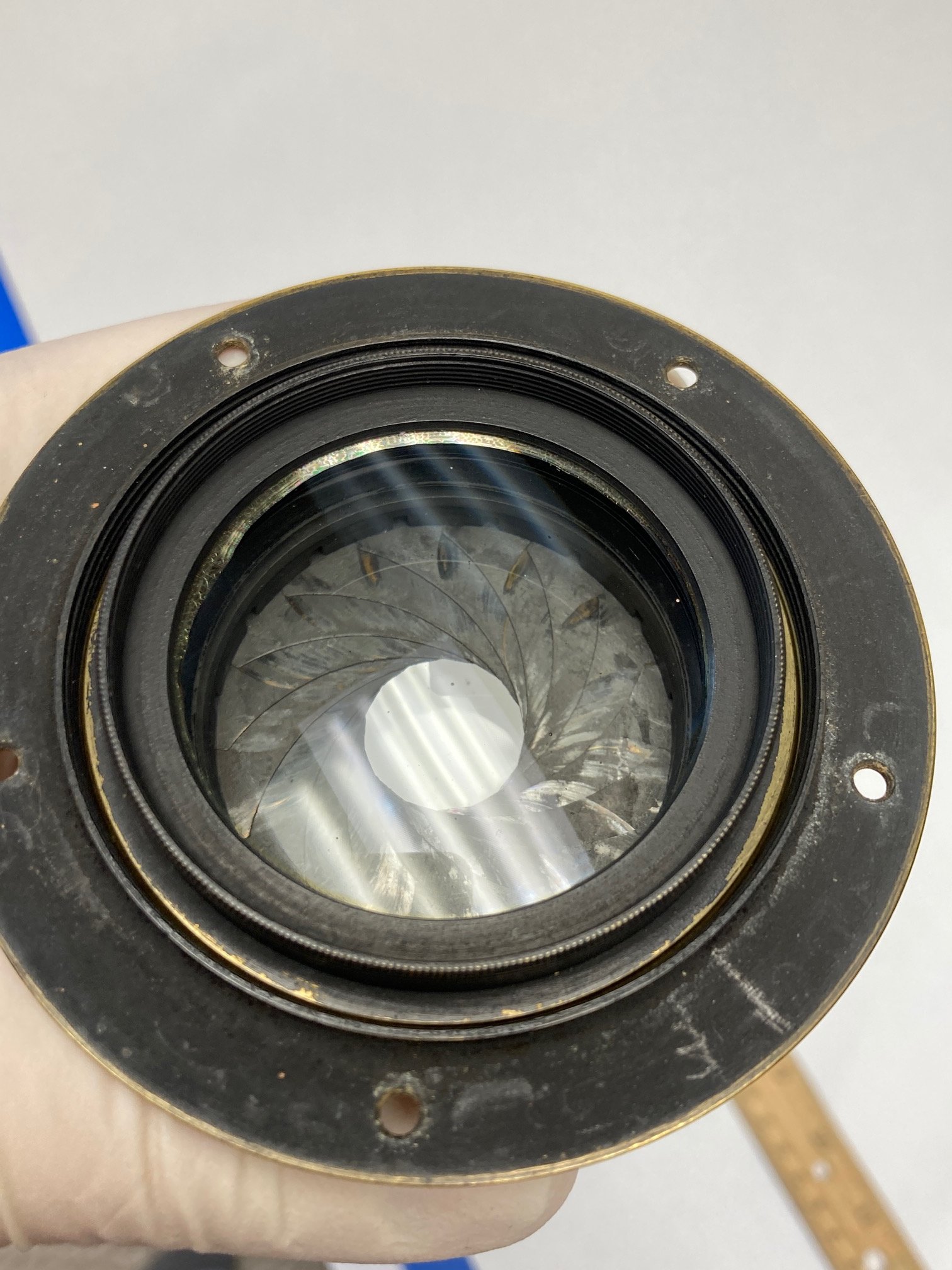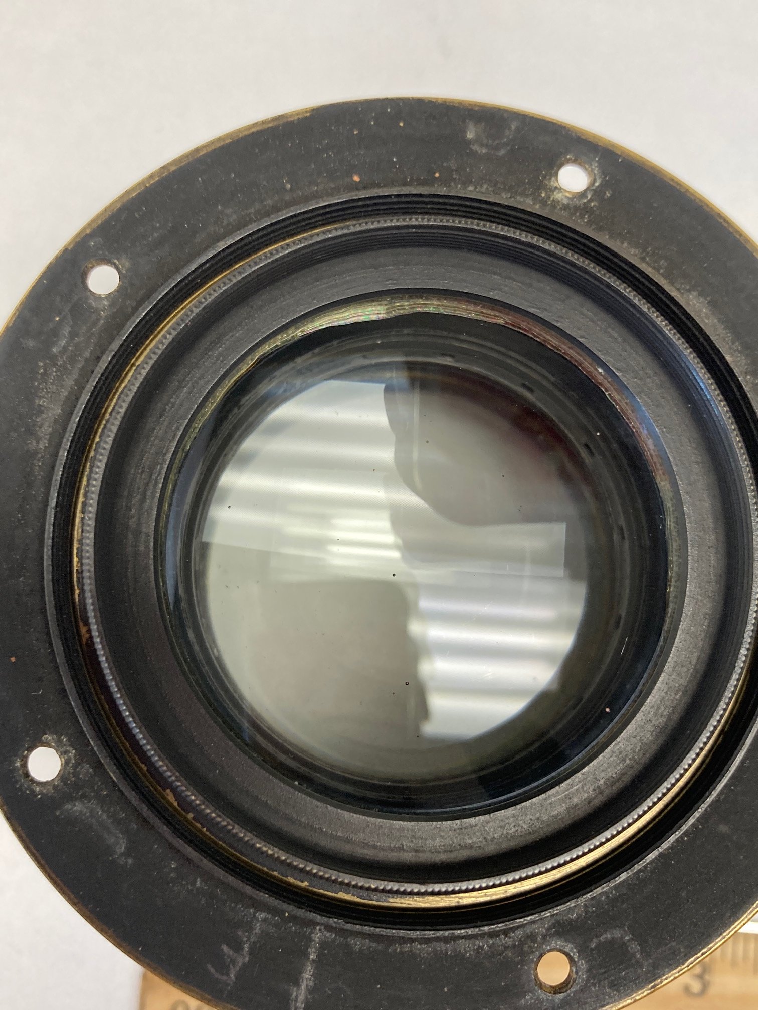 Condition - Lens has original flange. Aperture works fine ( many, many blades). Glass is clean and clear (no haze) but does show signs of 115 years of age with stray cleaning marks, some dust between elements and some balsam (glue) showing at extreme edge with slight separation in one spot, which is common on highly curved groups. All in all, good antique glass, but not perfect. Glass is an 8-, rest of lens 9- with no dings or dents.