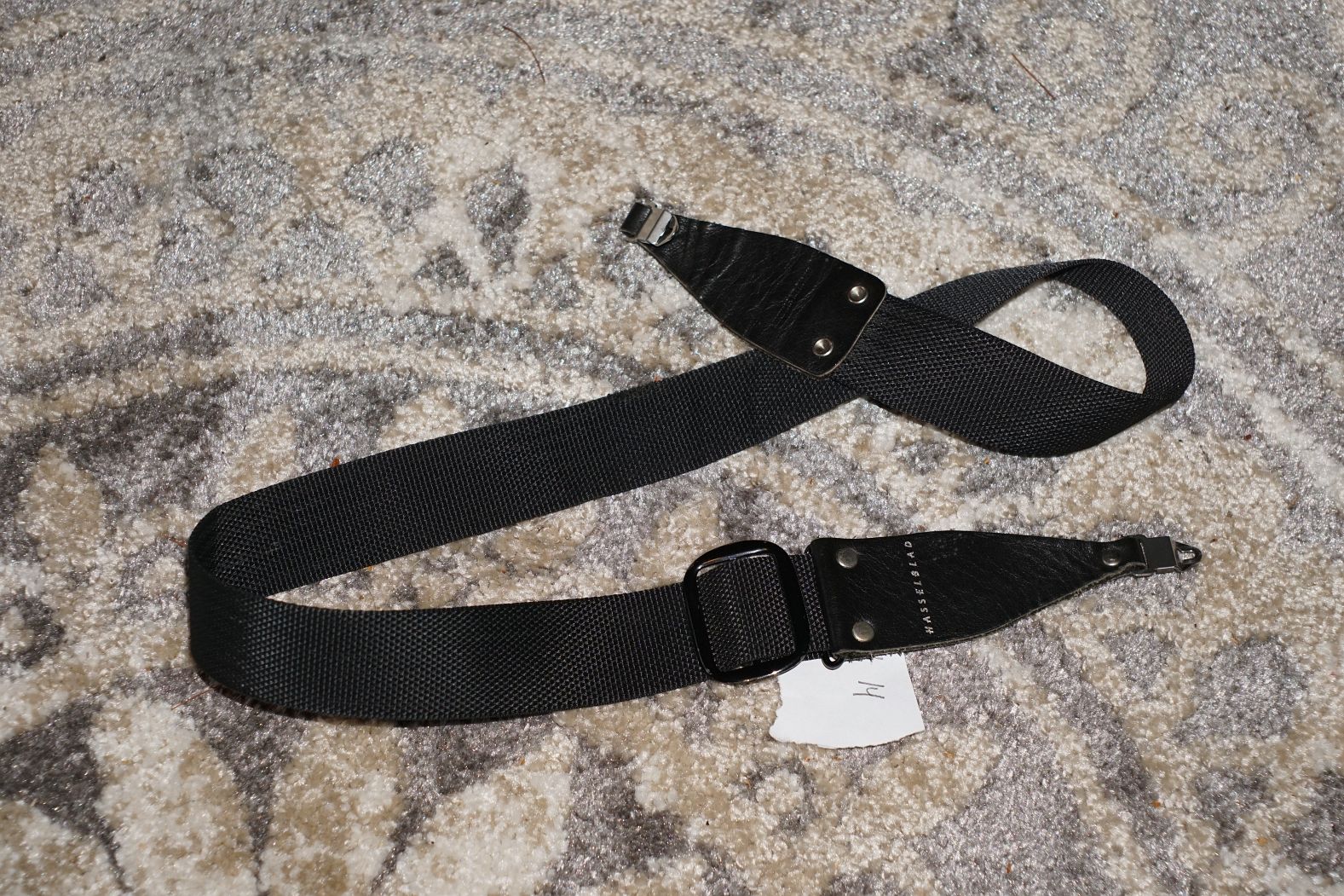 Lot 14: Hassleblad camera strap. Hassleblad brand (made in Sweden) adjustable cloth strap, 1 ½ inch wide, about 41 ¾ inch long from lug clip to clip. Nice used condition. I believe this is wider than normal but not sure. Used condition. $35 plus shipping.
