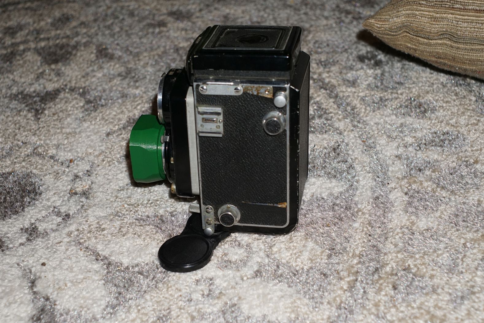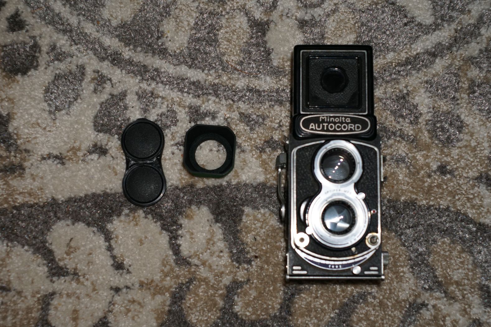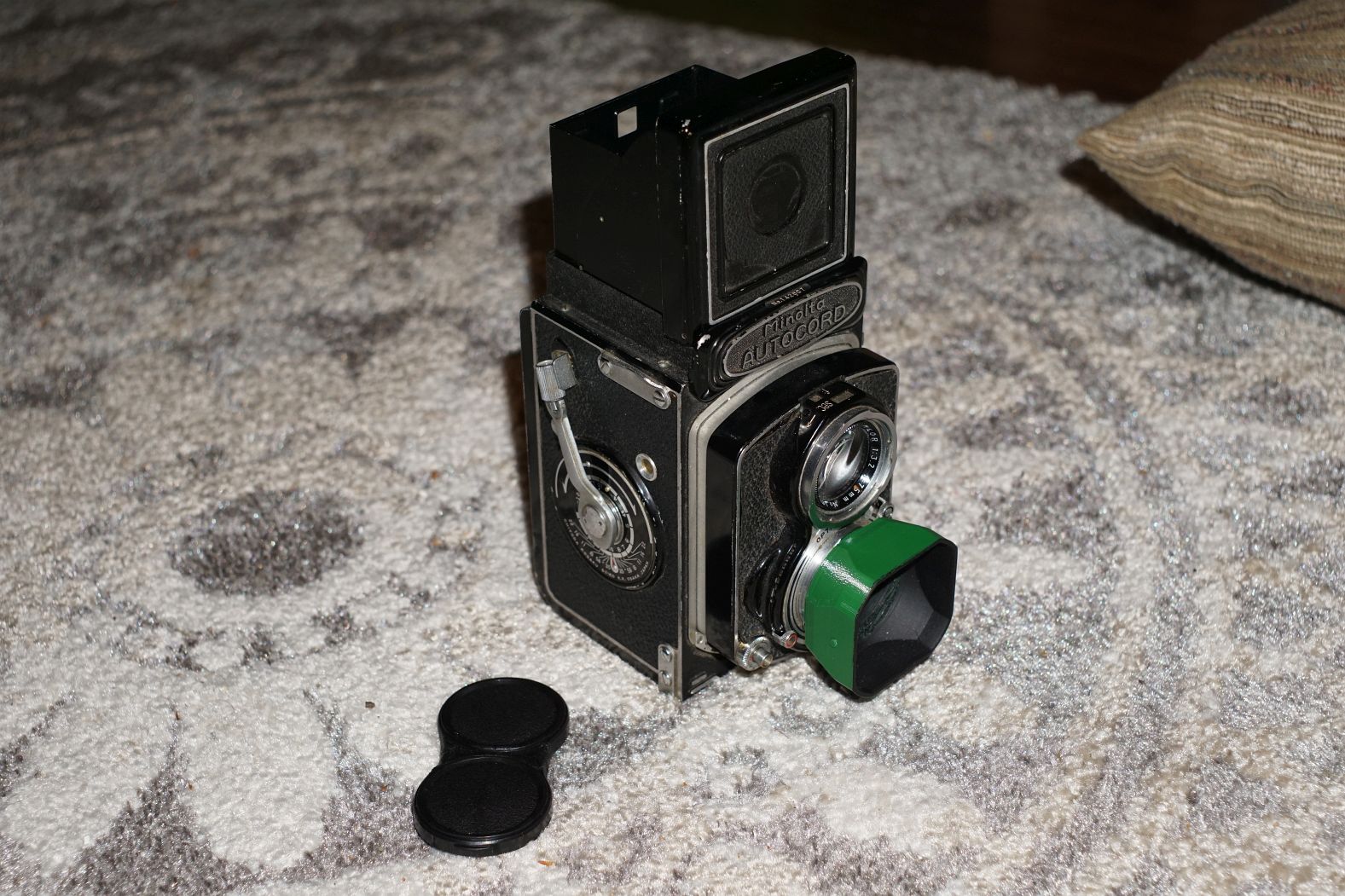 Lot 18: Minolta Autocord. This lot includes the camera and lens cap (cheap plastic) and hood (plastic). The hood is currently green but can easily be painted (the interior is already a flat black). Focusing lever working well. Good glass, everything in working order. Missing insignia on WLF and some skin is missing. Used condition. $220 plus shipping.