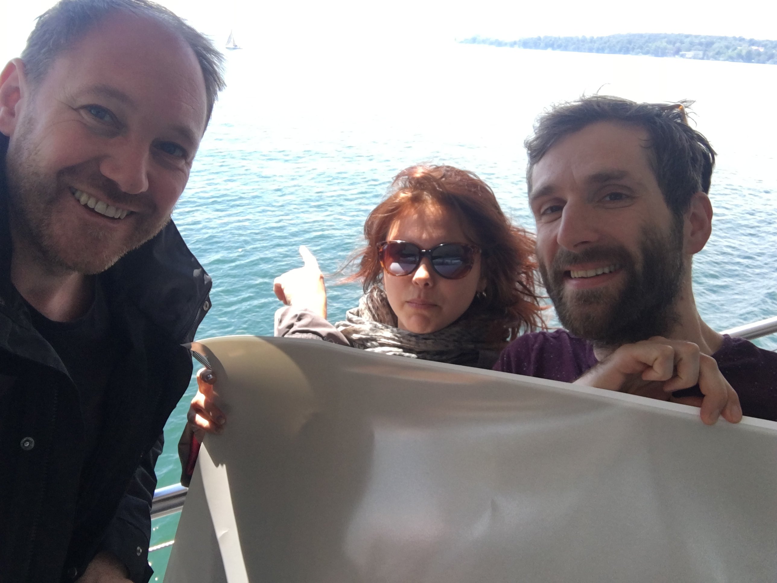 The photo shows the Team which moves between Switzerland and Berlin on the Bodensee Ferryboat with the first meter of new PW in their hands.