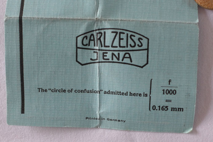 * Zeiss factory chart, showing various "distance focussed"/f values, with hand-written calculations for reduction "3", "4", "5"