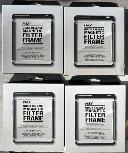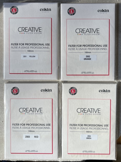 Here are four H&Y Magnetic Holders for 4"x4" (100mm x 100mm) filters and four Cokin 4"x4" resin filters - yellow, orange, red, and green - for black and white use. All this kit is unused and in the original packaging; I think I unpacked one of the H&Y holders when they arrived to see how it worked, but it went right back into its box after that. I'd planned to purchase the 95mm magnetic adapter so I could use these filters with my 72mm Super-Angulon-XL (also for sale on this forum) but subsequently found some reasonably-priced 95mm glass filters. This stuff has been sitting on my shelf for several years and I'm unlikely to ever use it.