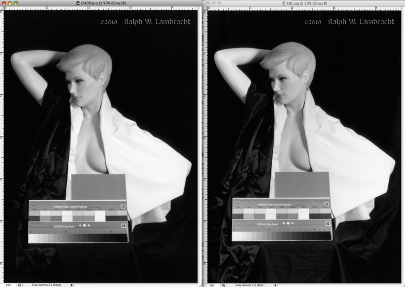 ...I attached a 6-stop example. If you look close, you'll see that the ASA 400 film (left) exposed at EI 6 (right) gives more shadow detail and shows no degradation in the highlights. Overexposure is no problem, but you may notice a slight increase in grain with 35mm film.