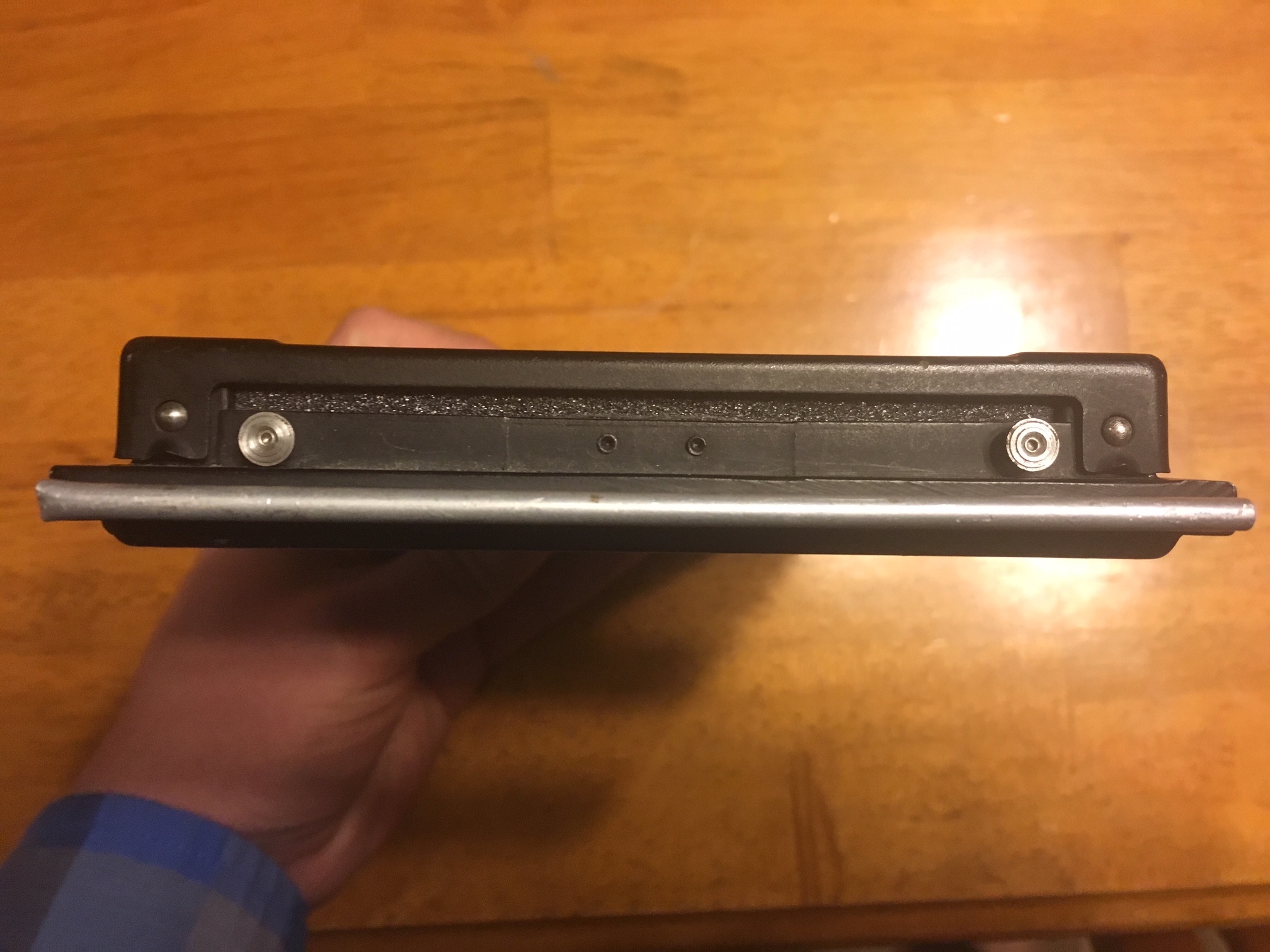 I bought an old DeJure 4x5 enlarger. The film holders for the DeJure are dual aluminum plate types that just sandwich the negative. With no hinge, the plate fits in fine.