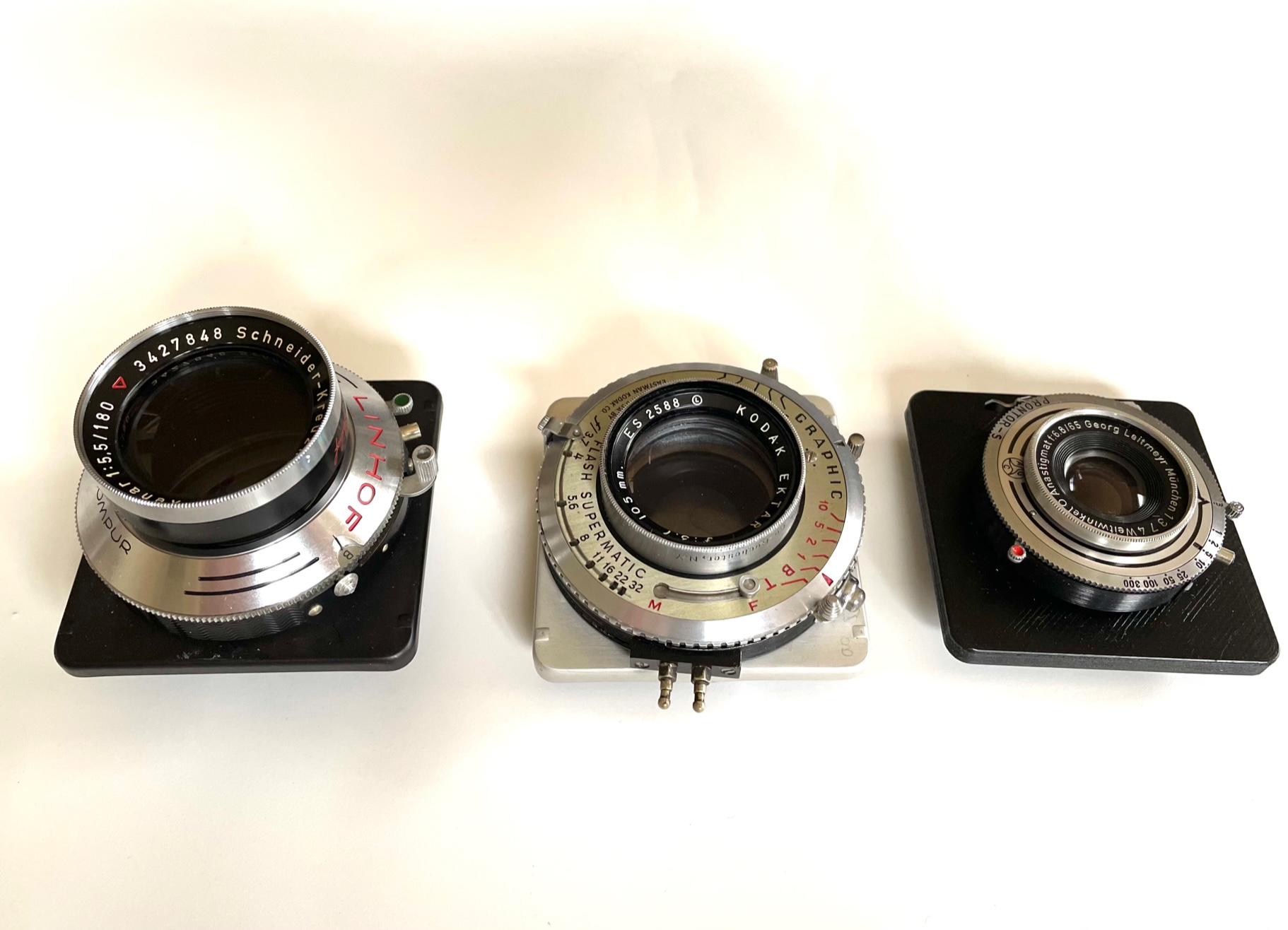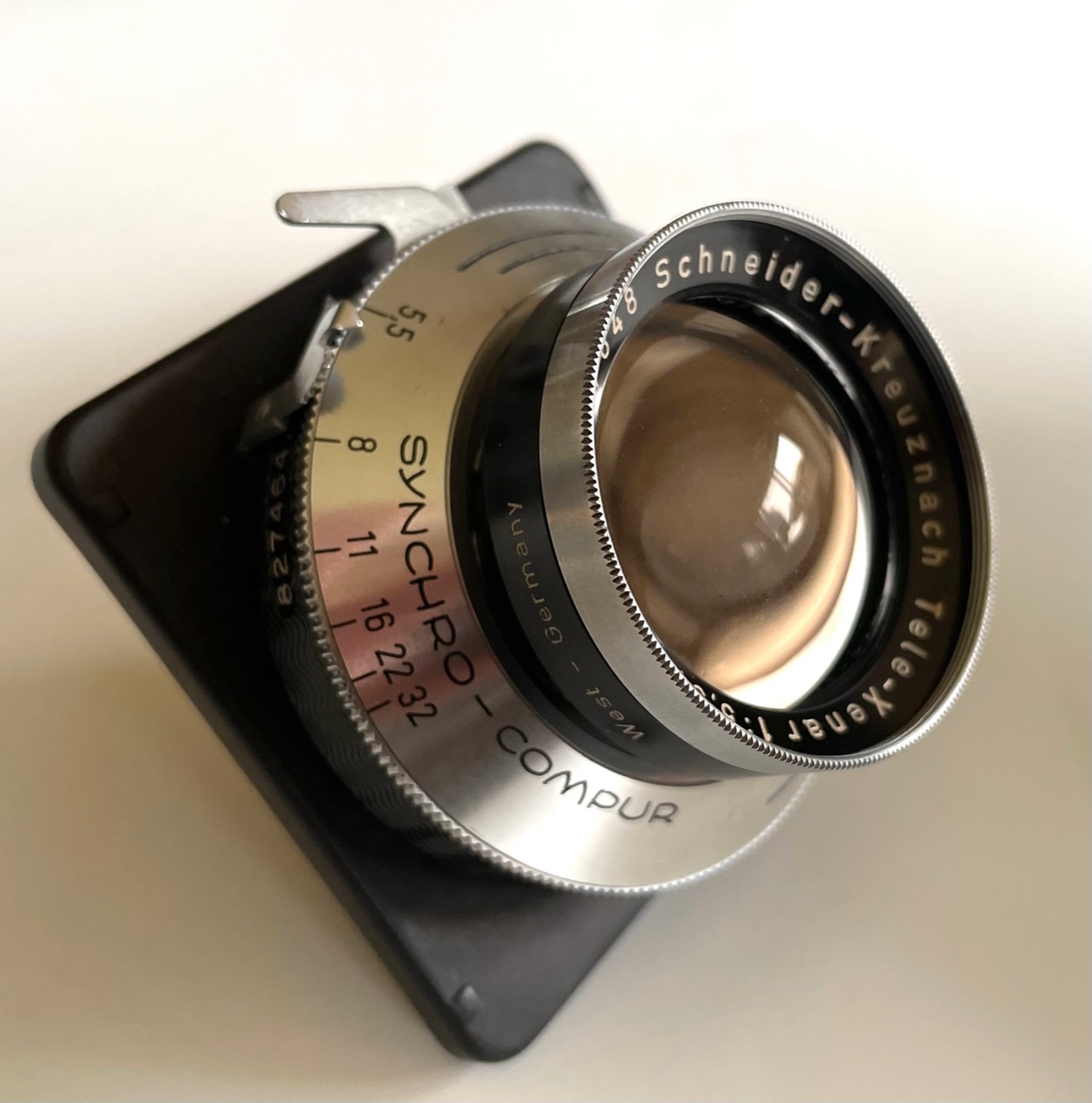 3) Linhof Select Schneider Tele-Xenar 180mm f/5.5 lens in a Linhof badged Compur shutter. Shutter and glass are in very good working condition. Has front and rear caps and is mounted on a metal 2 x 3 Graphic lens board.