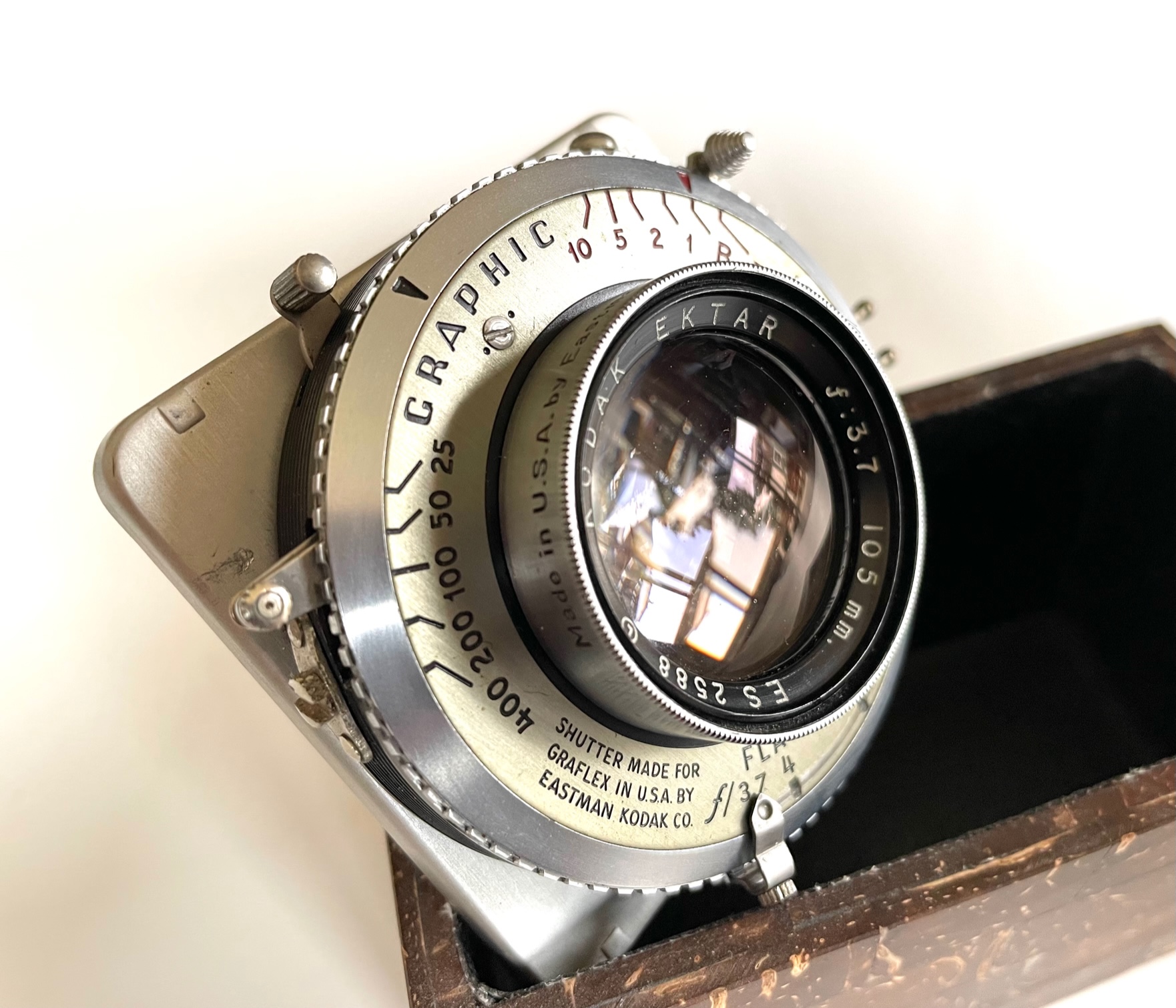 1) Kodak Ektar 105mm f/3.7 lens in a Kodak Flash Supermatic Shutter in bargain condition. The rear lens cell has some coating marks, dust inside and the shutter works but will eventually need a service. The f/3.7 lens projects a clear image to focus, it is a Heliar design. Has front and rear caps and is mounted on an original