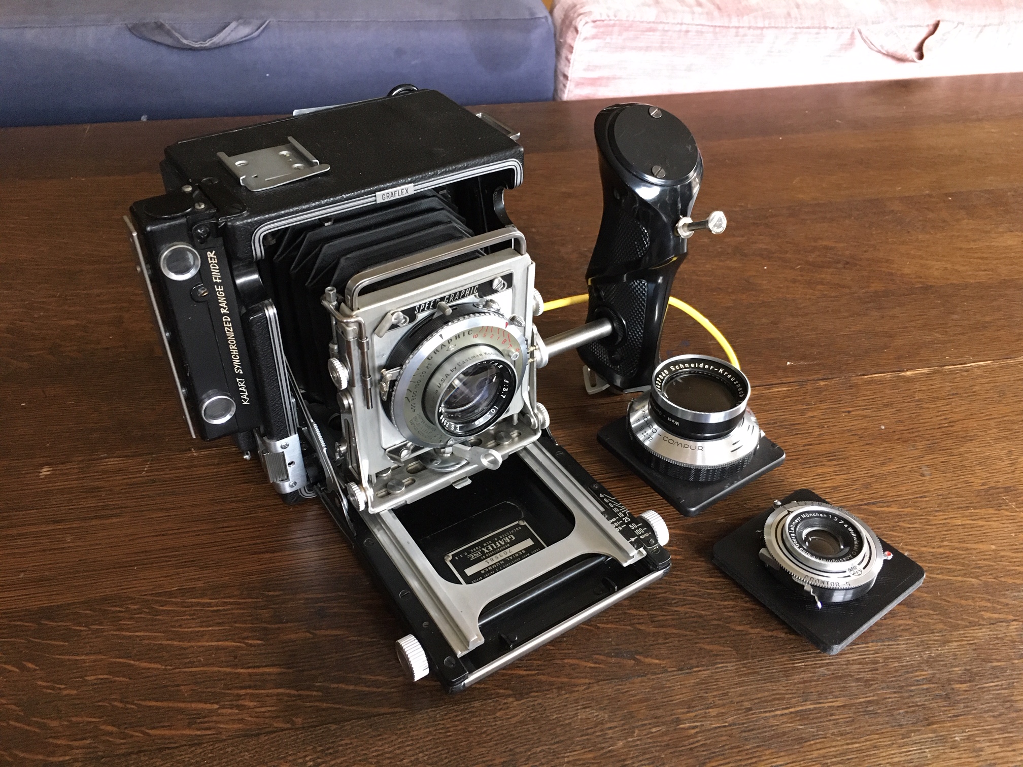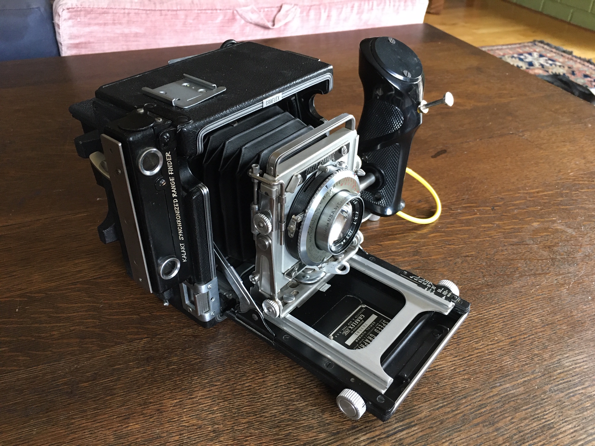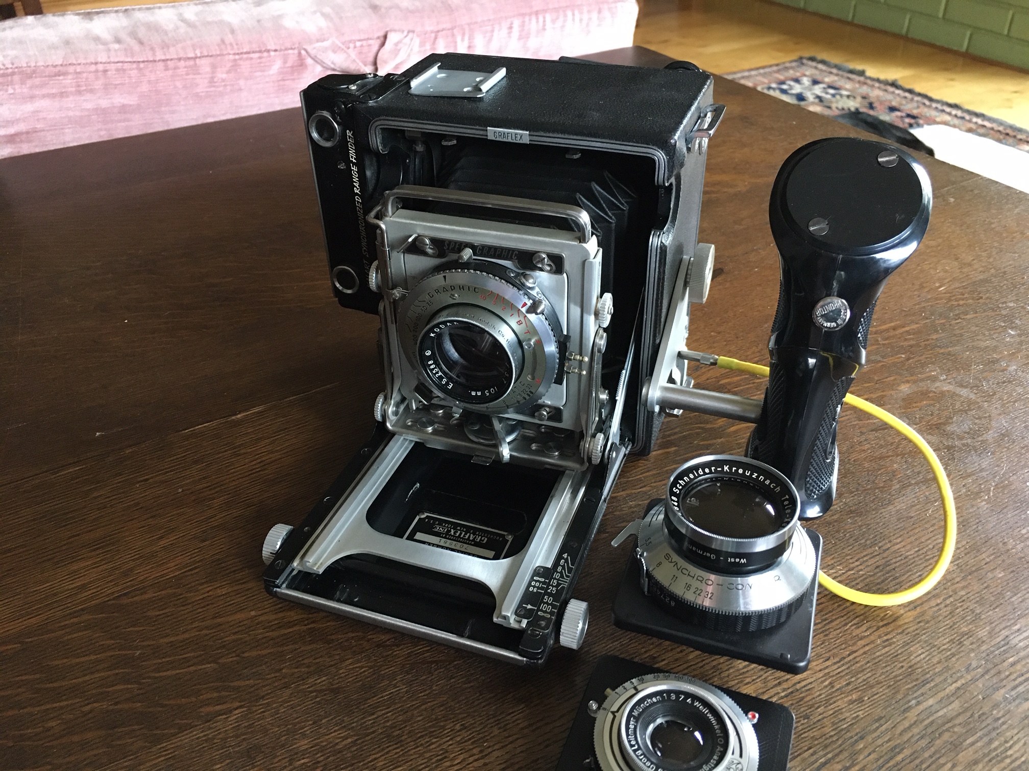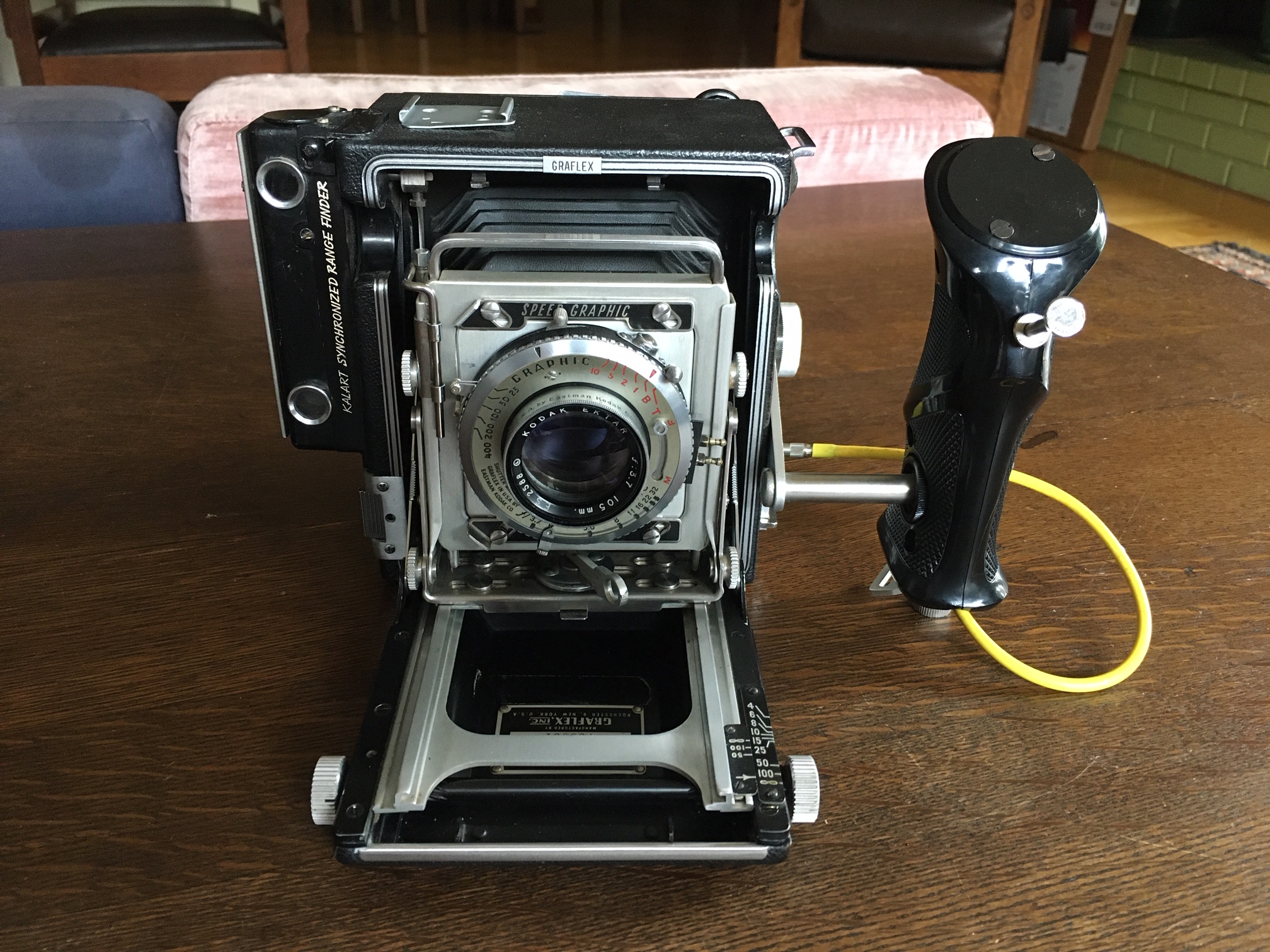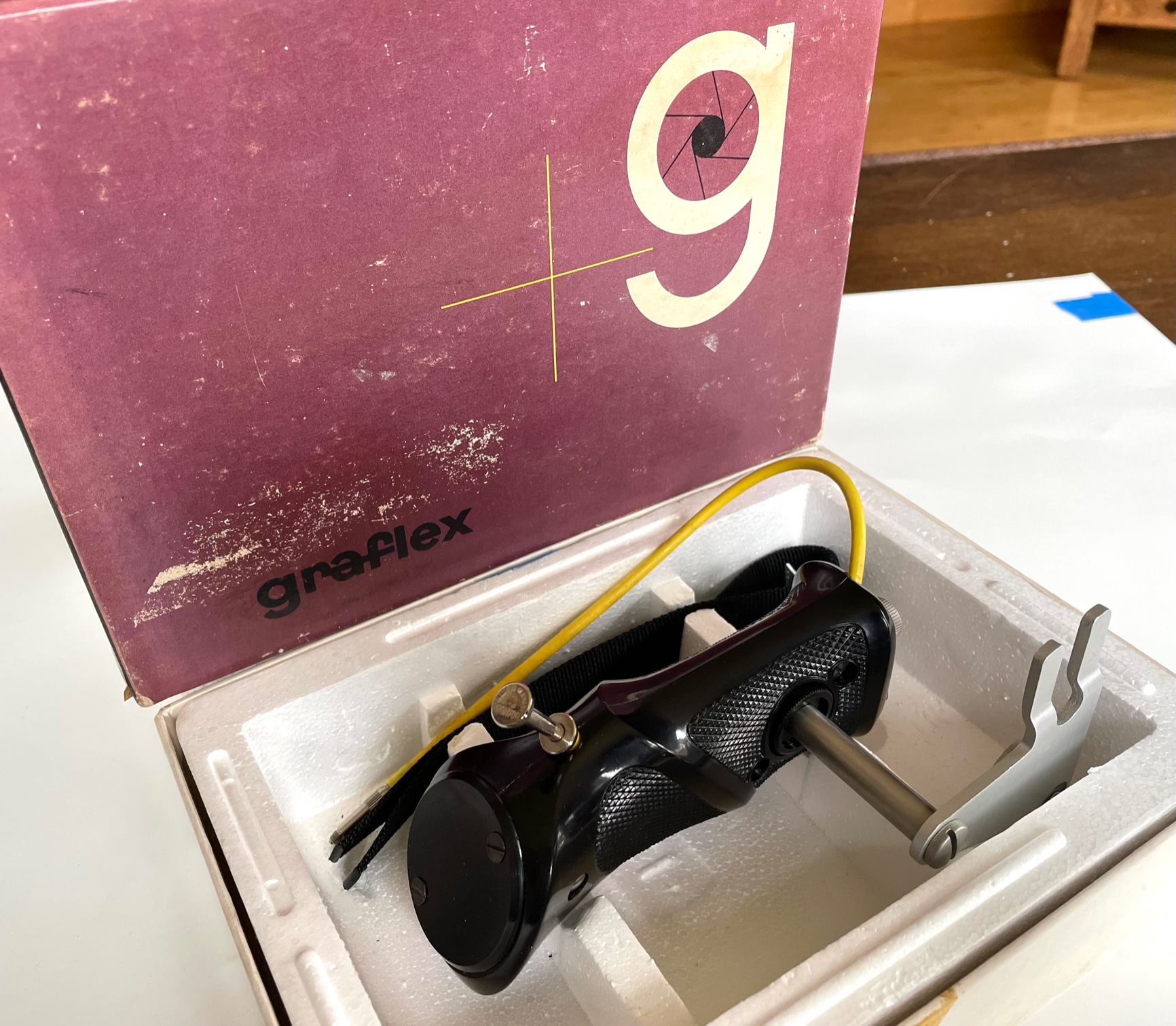 original box, has a cable release installed and easily mounts on the side where the handle goes. This transforms the Speed Graphic into a comfortable, easy to use hand-held camera.