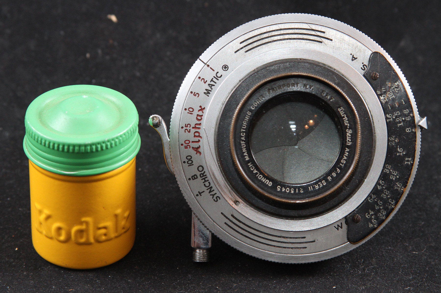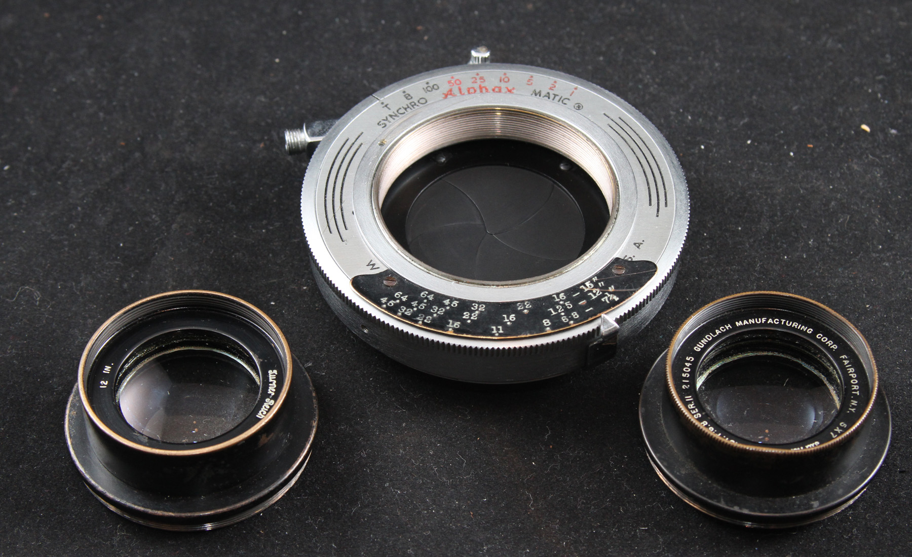 Here’s a 5x7 Turner-Reich triple convertible by Gundlach in Fairport, so a fairly late one. Focal lengths are 7 ½”, 12”, 15”. Shutter is a Wollensak Alphax. Slight flat on the rear barrel, and a larger one on the front barrel. Shutter works on T & B. 1 second sounds a bit fast, but the speeds are progressive from there. Glass has some very light scratching, and very light edge separation, almost nothing by the standards of T-Rs. No flange.