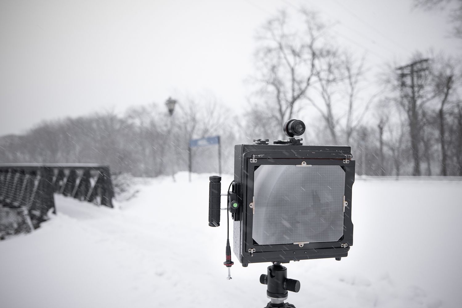 This 8x10 ‘point and shoot’ (bit of an oxymoron, I know...) couples an 8x10 Deardorff back (with fresnel and grid GG) with a helical mounted 210mm f/5.6 L Fujinon giving you the approximate field of view of a 28mm lens. Shooting 8x10 is a slow and deliberate process and this camera is quite comfortable being shot in this traditional manor. But what is more exciting to me is venturing into some non-traditional areas for this format. This camera makes aerial photography, car to car, street photography, and other handheld applications possible.