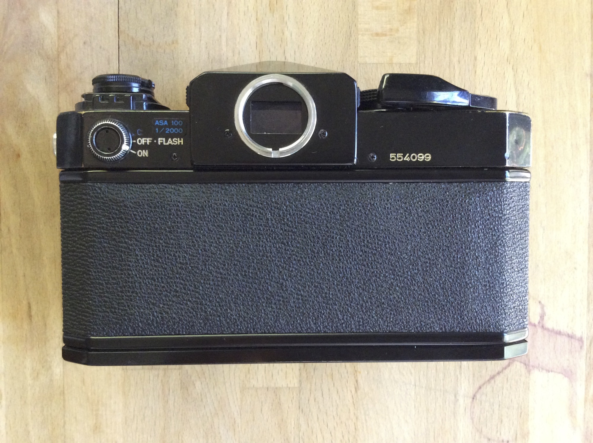 For sale: Canon F1n (little "n", second version of the first Canon F1, not the "New F1"/"F1N"). This one should be considered for parts/repair/project though I believe it has "good bones" and would respond very well to a CLA. I used it with no issues a few years ago, but since that time it has sat unused and the slow speeds now mostly hang up, while 1/1000 and 1/2000 appear to be capping. Other than that, I don't see any major issues. Meter is responsive, metal shutter curtains have minimal rippling (I've shown both curtains in the photos), viewfinder and screen are very clean and clear. The screen is the "E" type; the obligatory dent on the plain prism is a small one. Includes body cap but eyepiece trim ring is missing. Battery compartment is clean. Overall a solid example of a classic, most likely just in need of a little TLC. See photos for cosmetics.