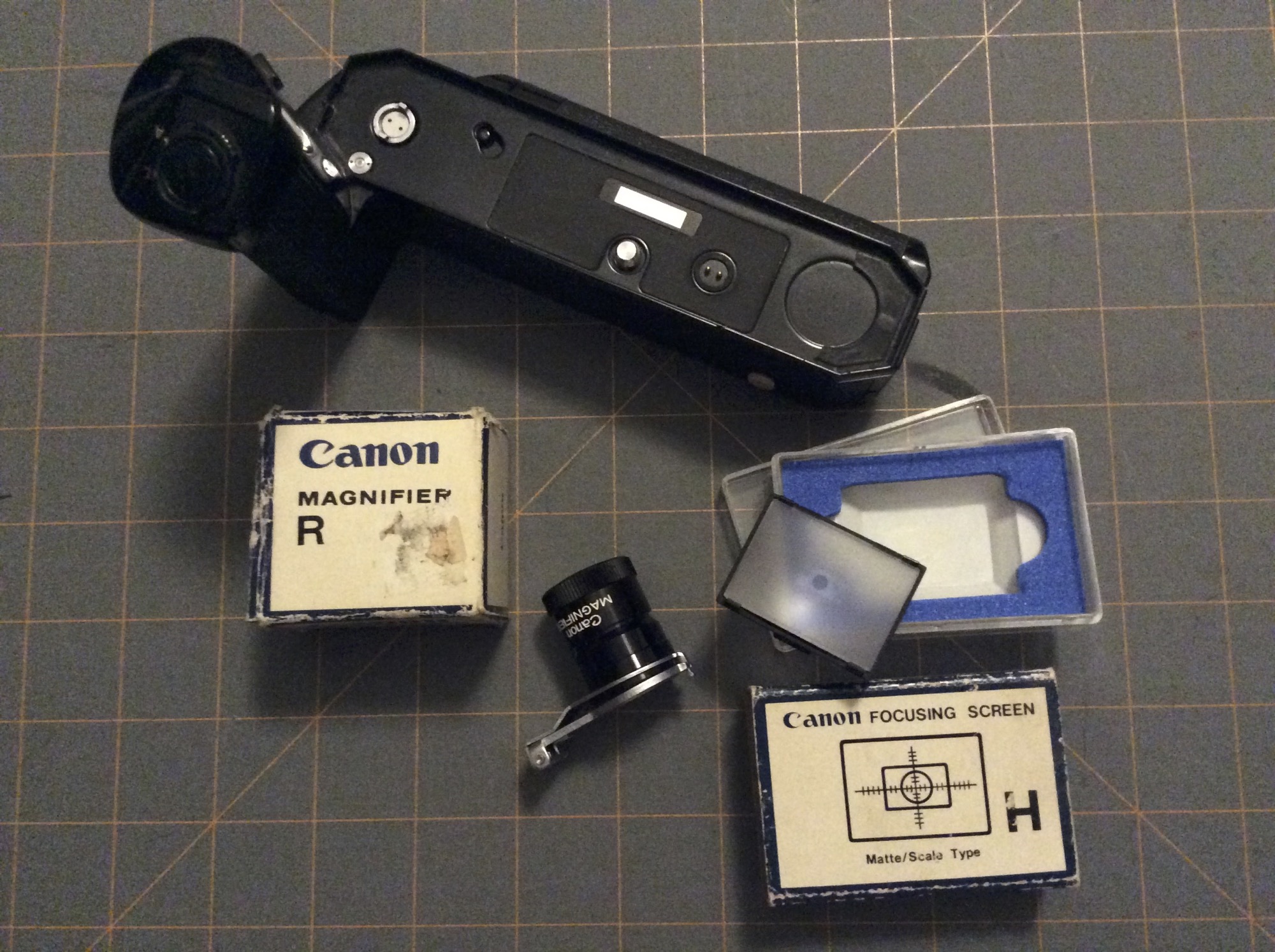 Canon Magnifier R: box is scruffy but the magnifier is in excellent shape and will probably stay that way since without the F1's eyepiece ring you'd have to hold it in place on the camera... optics have a little dust but otherwise clear.