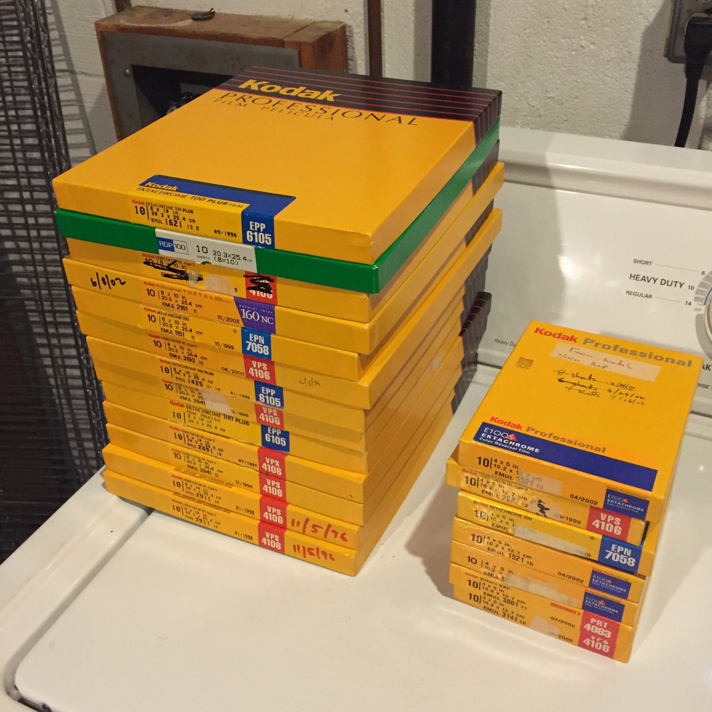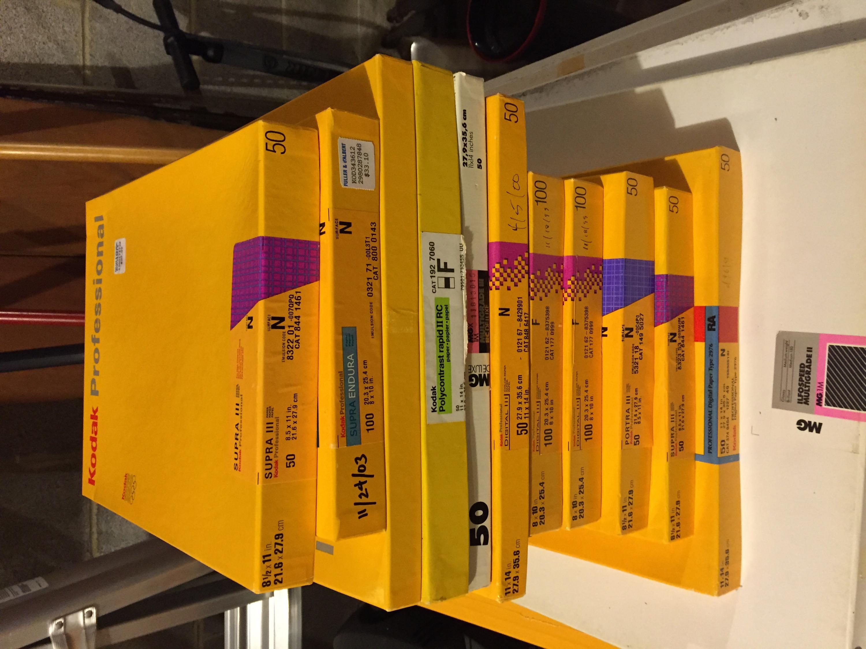 3. Color paper. See the photo, but you'll see Supra Endura, Supra, Porta, and Digital (silver halide - RA process from a LED light source) Some is full, some is near empty. Just ask and I'll give you a price, but it'll all be cheap ( $5-10) All was kept frozen until the past week. This is pretty much all 8x10, but if you want bigger, I might have it.