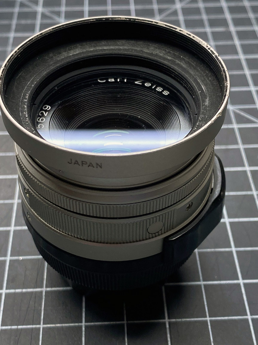 Includes rear cap, protective filter, and metal lens hood - all original Contax accessories.