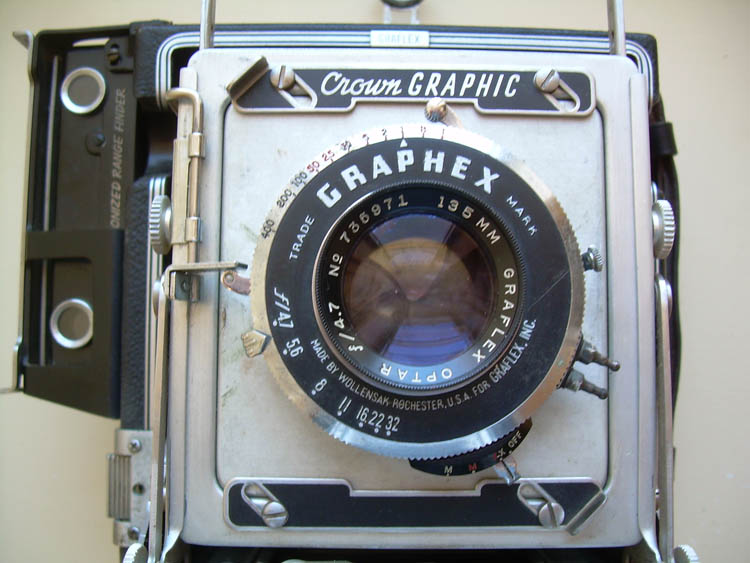 A nice little 3.25 X 4.25 Crown Graphic with a 135mm f4.7 Optar lens in Graphex shutter. Camera is in good shape, rangefinder is synched to 135mm lens and works fine, focusing is smooth, shutter fires on all speeds including T and B and shutter and aperture blades open and close smoothly and are oil free. Glass is in fine shape with just a few cleaning wisps and the shutter release on the body works fine. Comes with 3 double film holders.