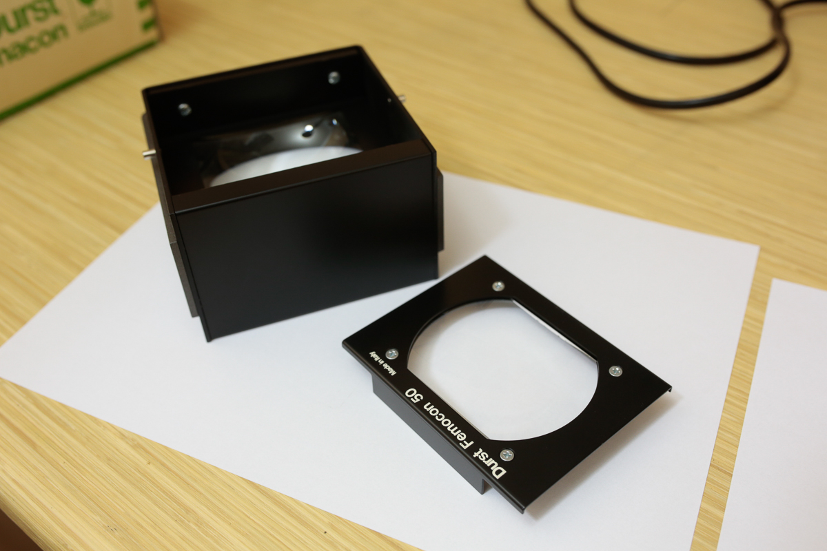 There is NO BOARD ! I bought it without board and just screwed it directly into my darkroom table. You will get all screws for rigit and safety mounting.