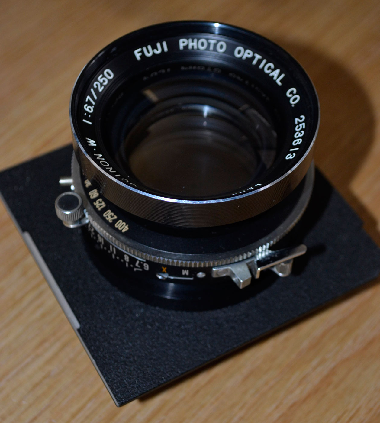This is the f/6.7 version with very a generous image circle on 8x10. It works perfectly, the shutter is spot on. There are two issues. There is a small dent on the rear outer barel that prevents the use of filters on the rear element. It is minor. The second issue is some oil on the aperture blades. It's been this way for the 10-12 years I've had it and does not cause a problem. I never thought the need to get it cleaned although this could be done relatively inexpensively. It's mounted on a linhof style lens-board. My asking price has been adjusted for the condition. I'm asking $225 US net. Forgot to mention that it comes with the original metal lens caps, and I'll also include a lens wrap with the lens.
