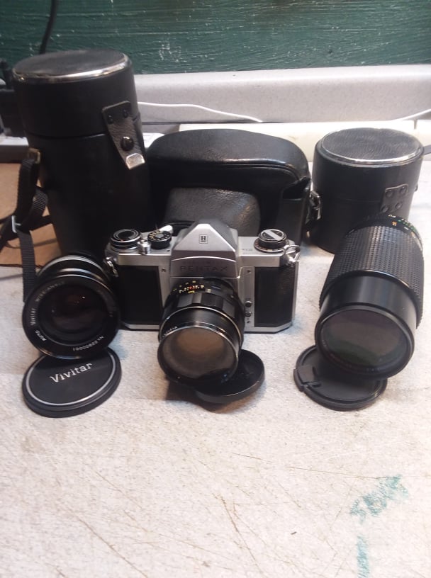 Someone should really snag this kit. The H1 is very close to a Spotmatic to use. The Super-Takumar 55mm is also a well regarded lens. That Vivitar 28mm is made by Kiron and is no slouch, I have one.