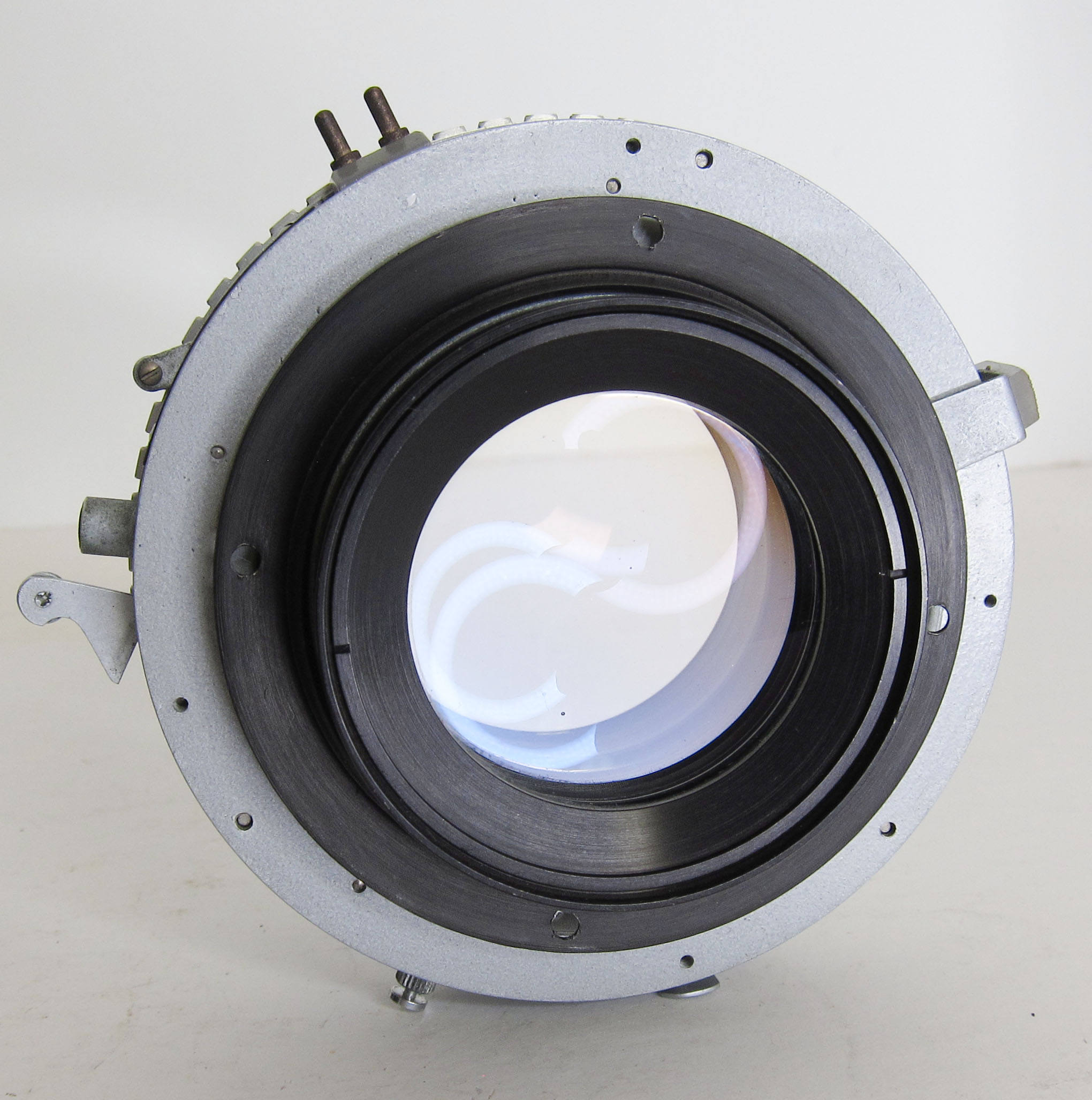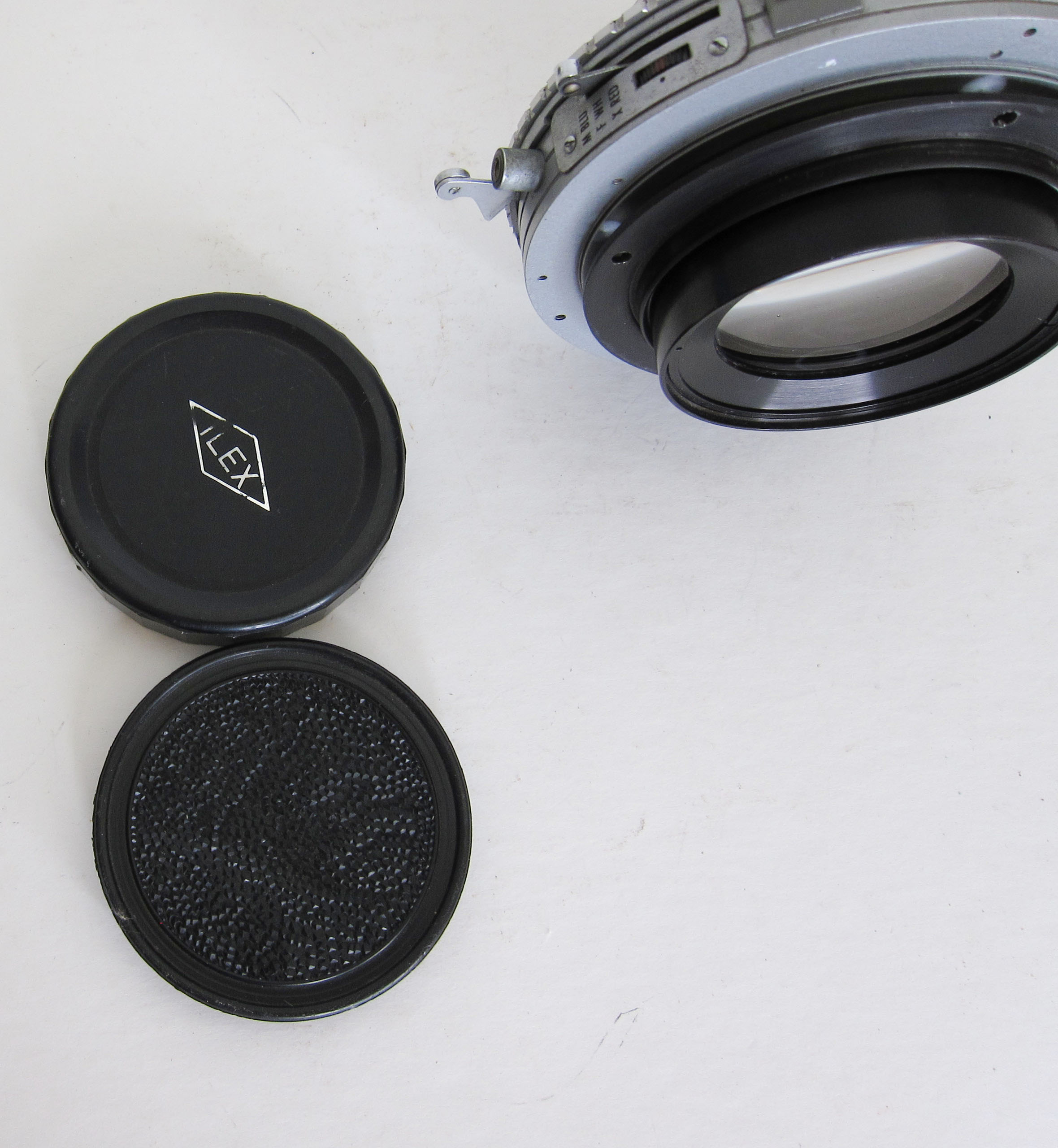 Lens and shutter in good shape, although there is some coating loss on front surface. Includes caps, mounting flange.