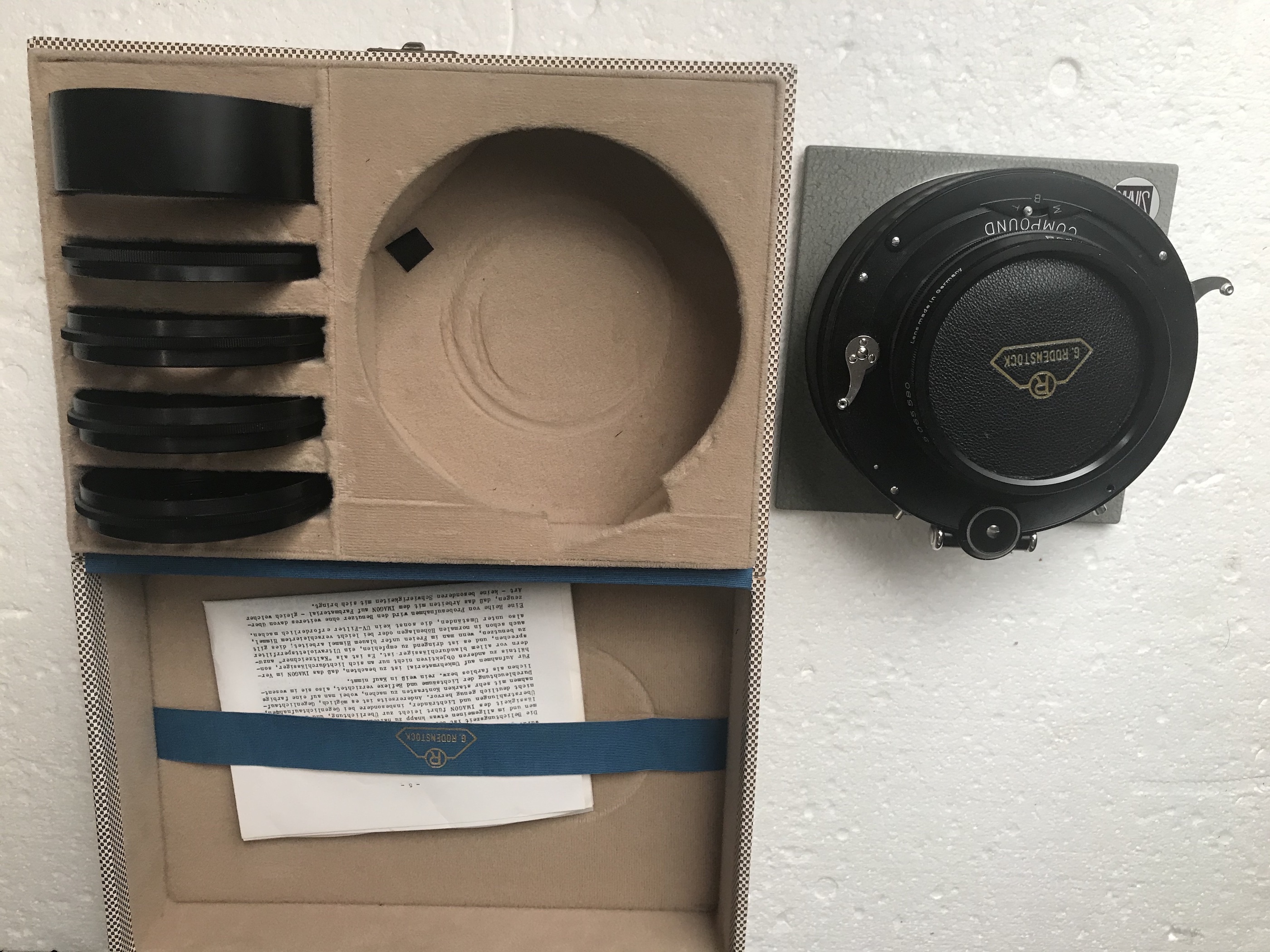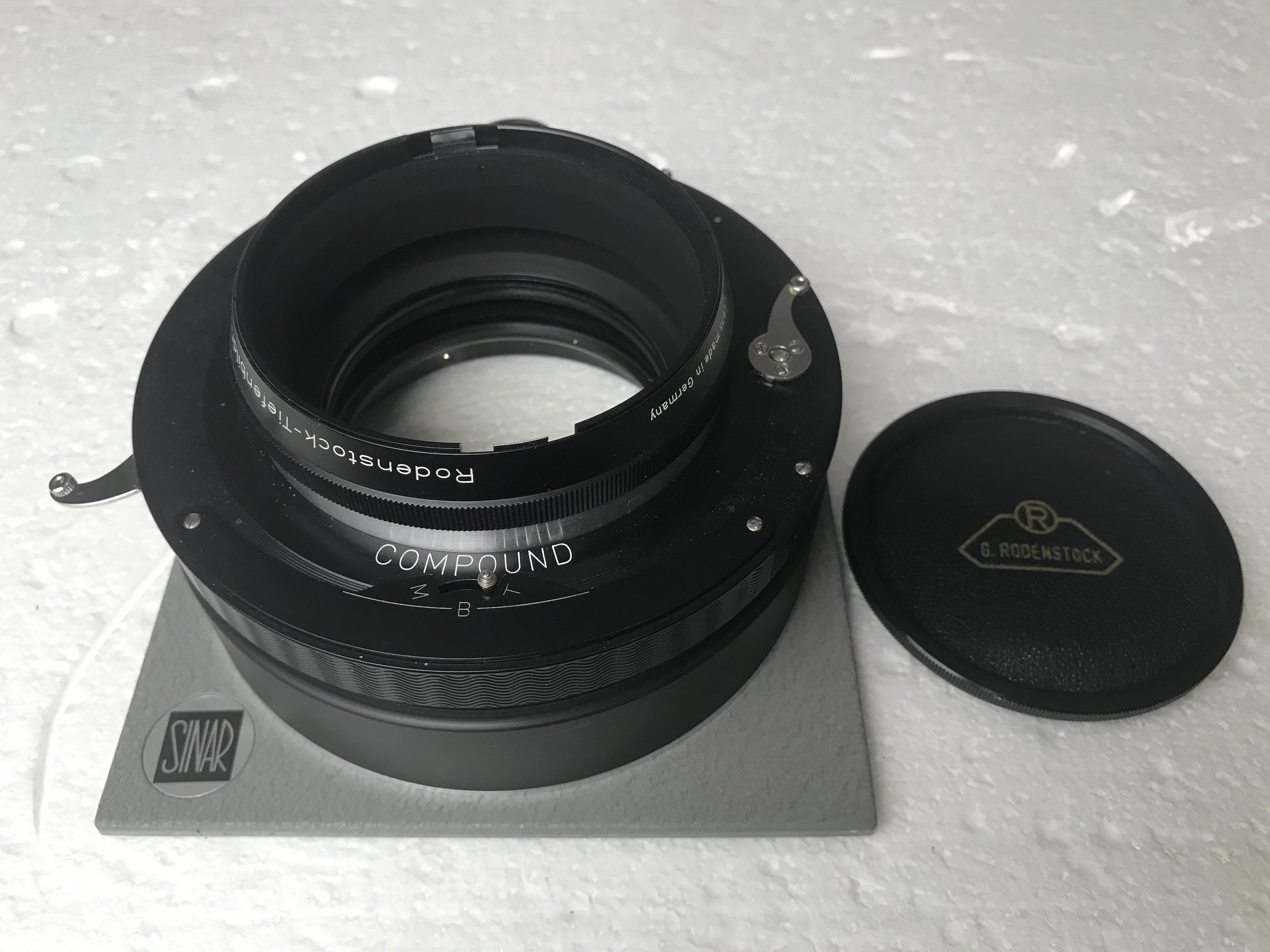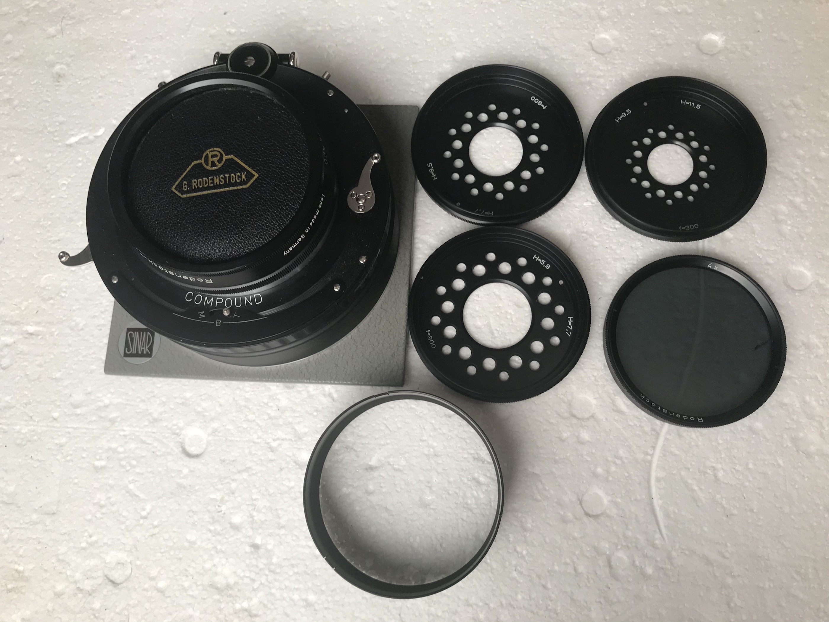 4- Rodenstock Imagon 300mm in Compound shutter, ND filter, 3 disks lens cap, hood and Imagon box. The lens is in very good condition and so is the shutter with one little fault being that one of the screws holding the shutter face plate is missing, does not influence the function. Mounted on a Sinar board with spacing, so can also be used with a Sinar Copal shutter. €550