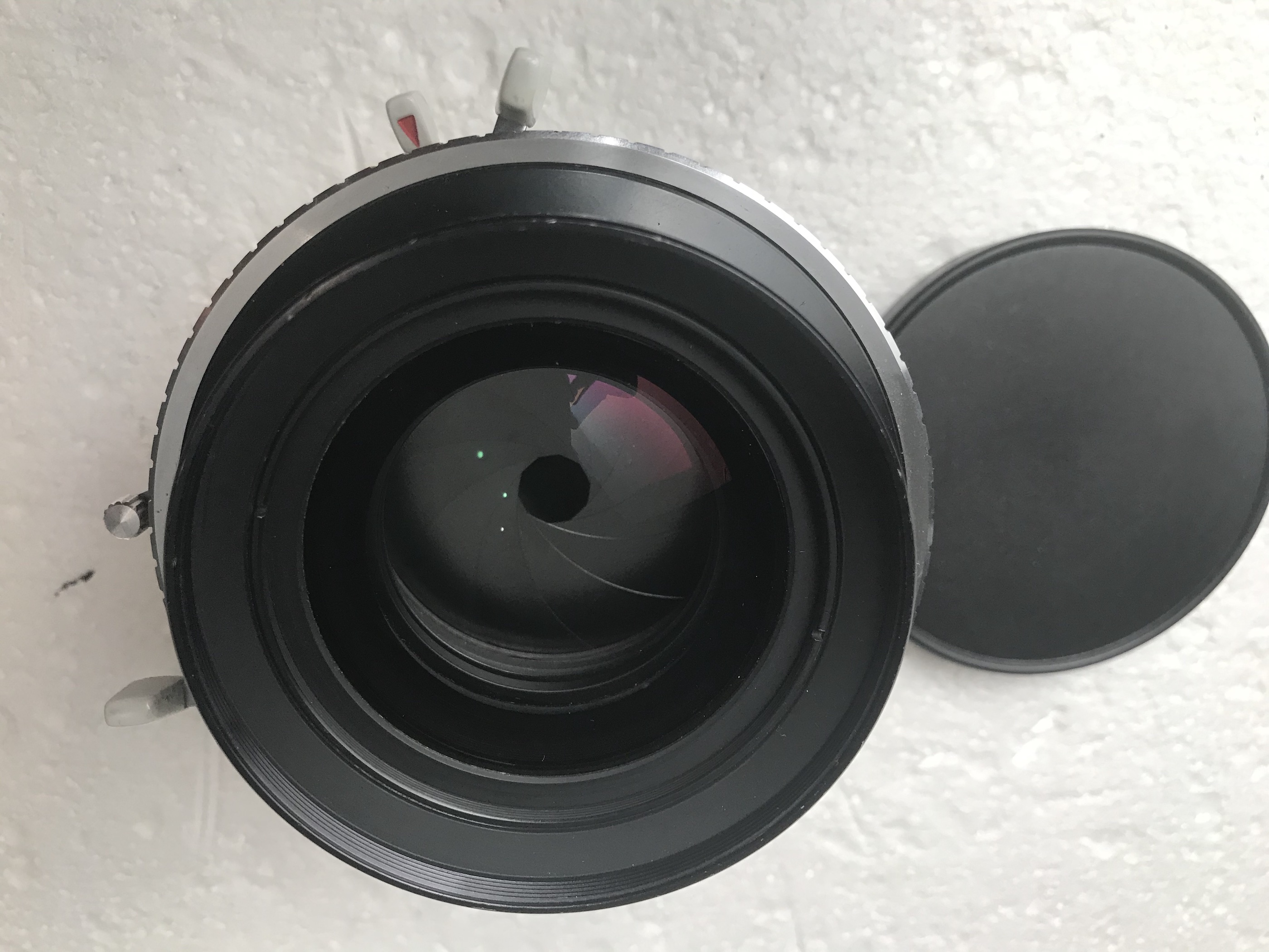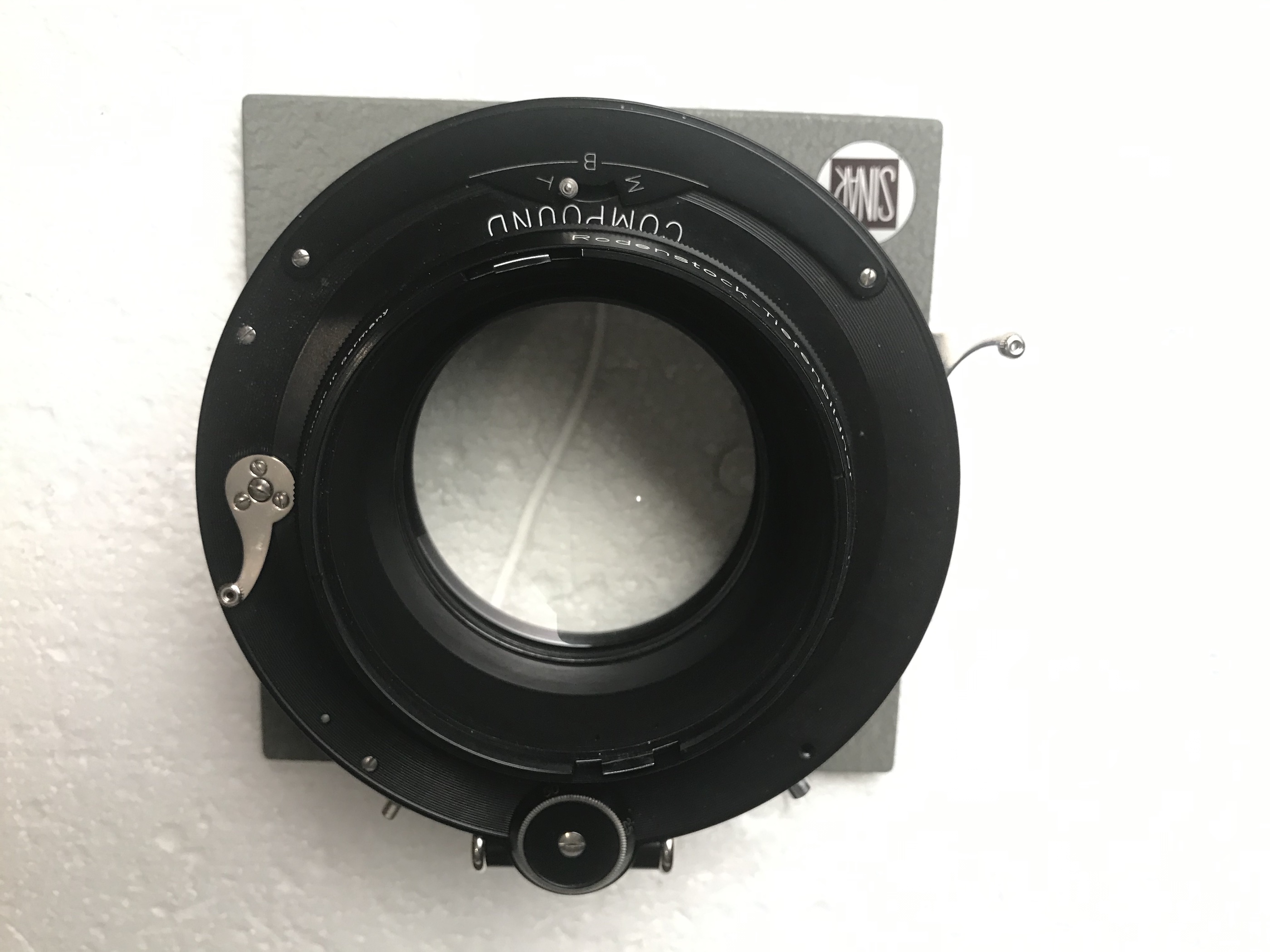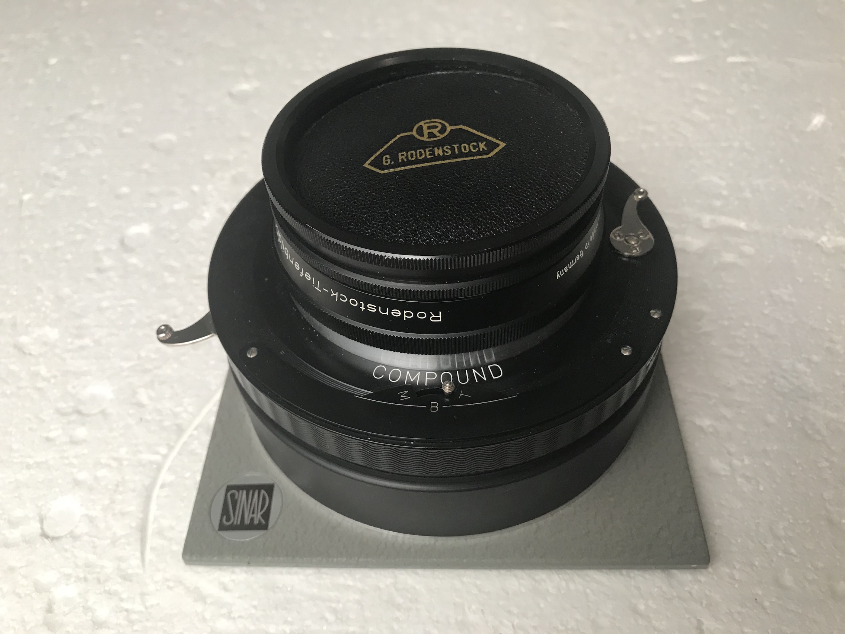 4- Rodenstock Imagon 300mm in Compound shutter, ND filter, 3 disks lens cap, hood and Imagon box. The lens is in very good condition and so is the shutter with one little fault being that one of the screws holding the shutter face plate is missing, does not influence the function. Mounted on a Sinar board with spacing, so can also be used with a Sinar Copal shutter. €550