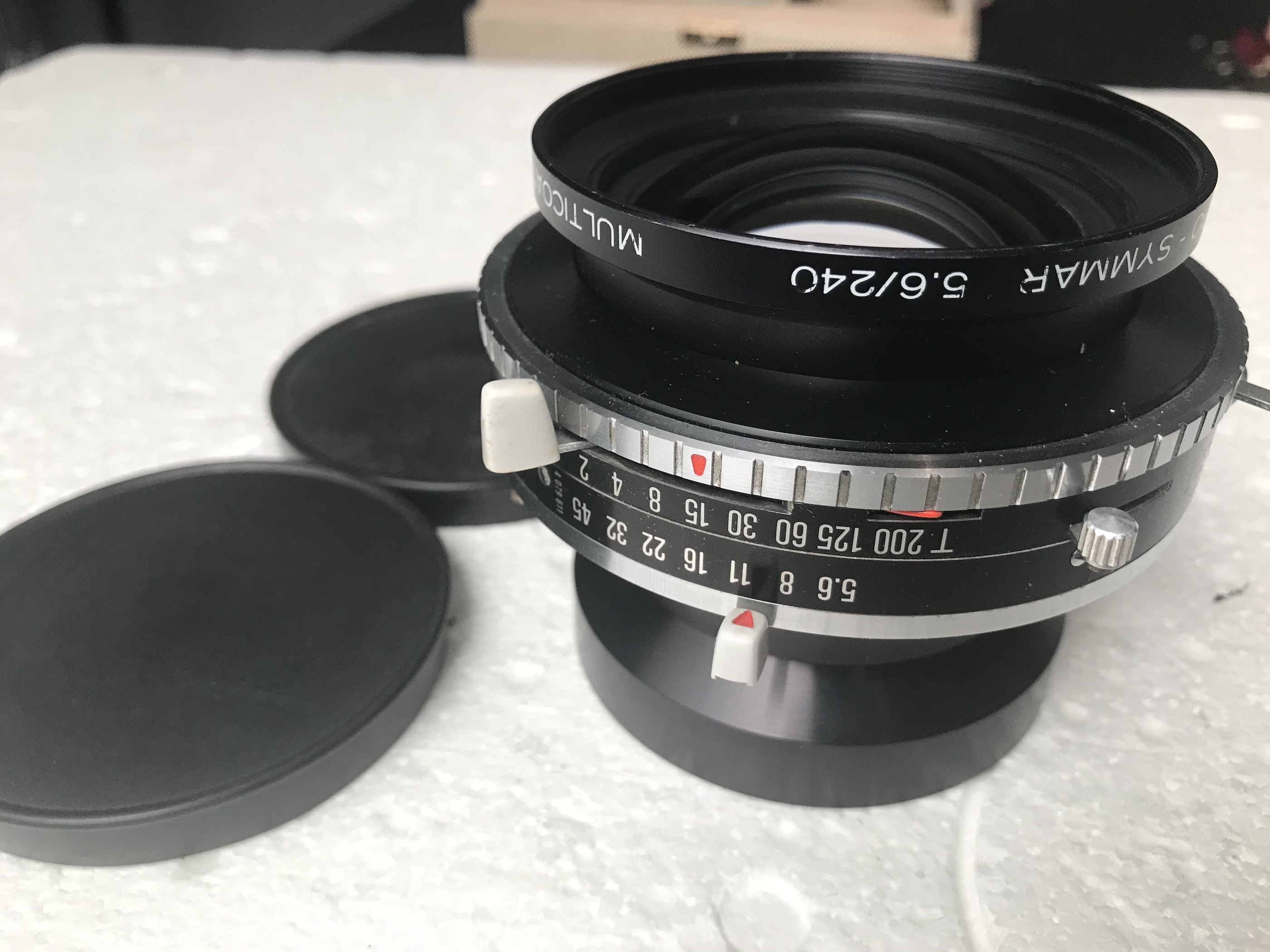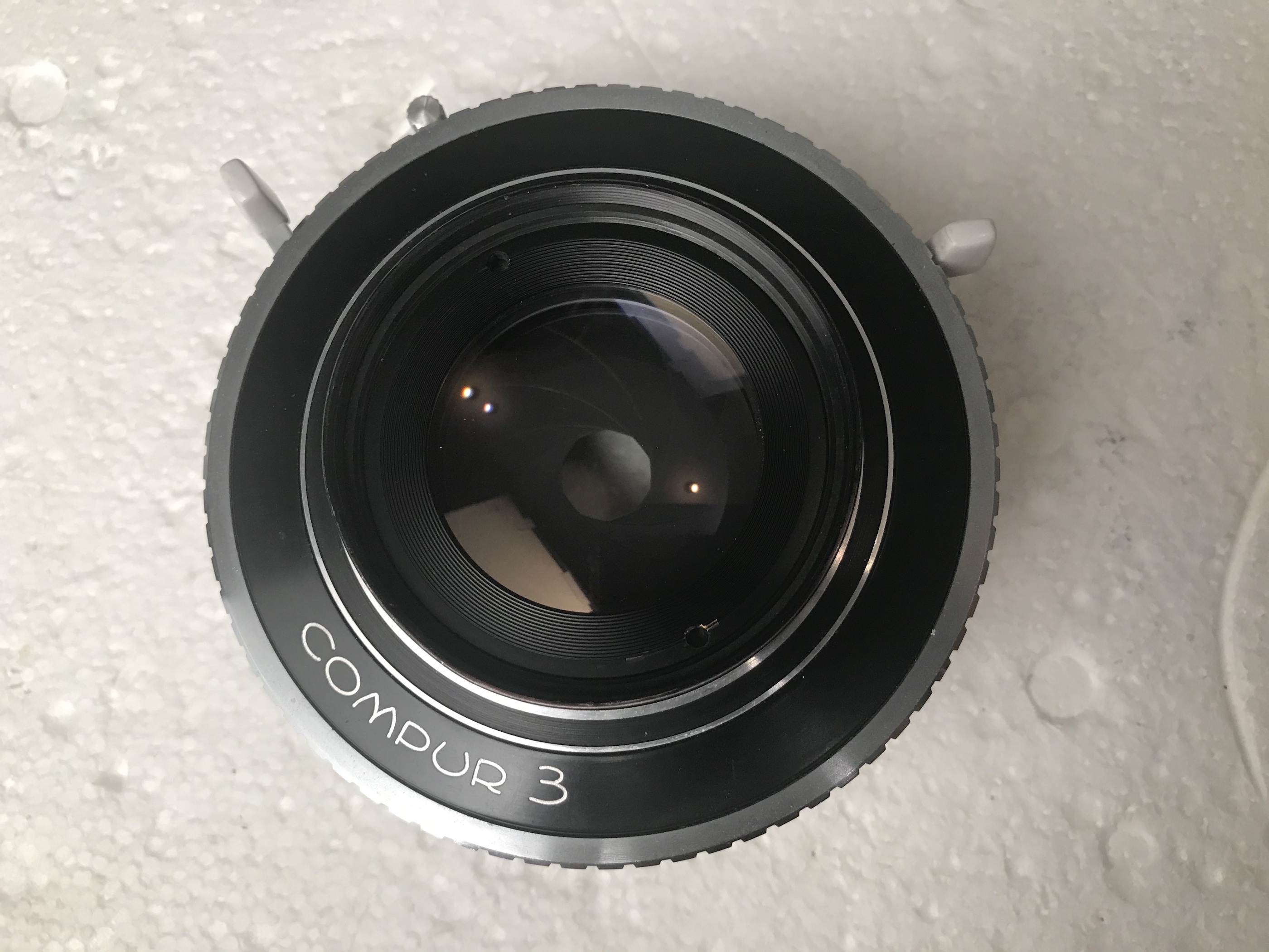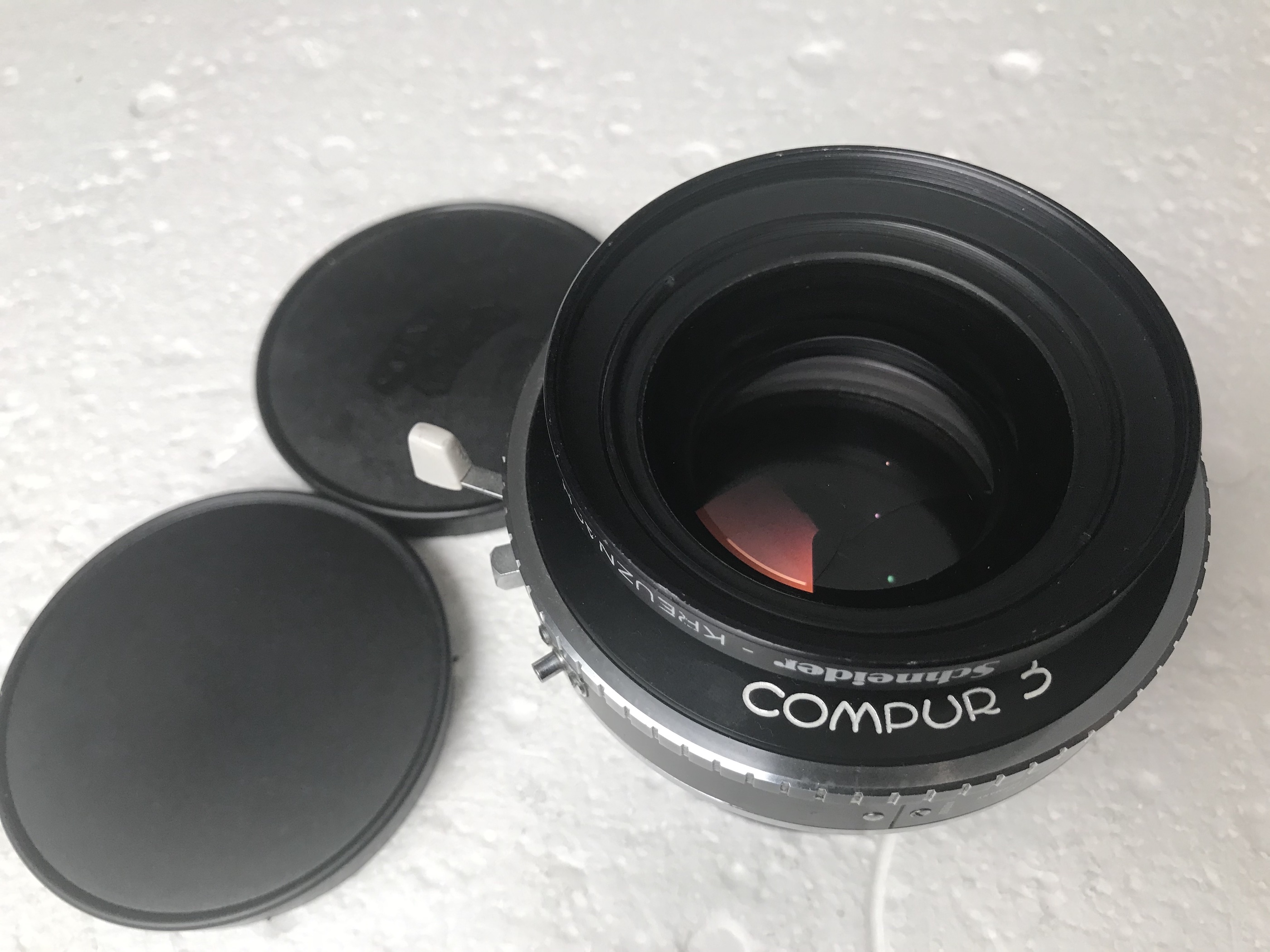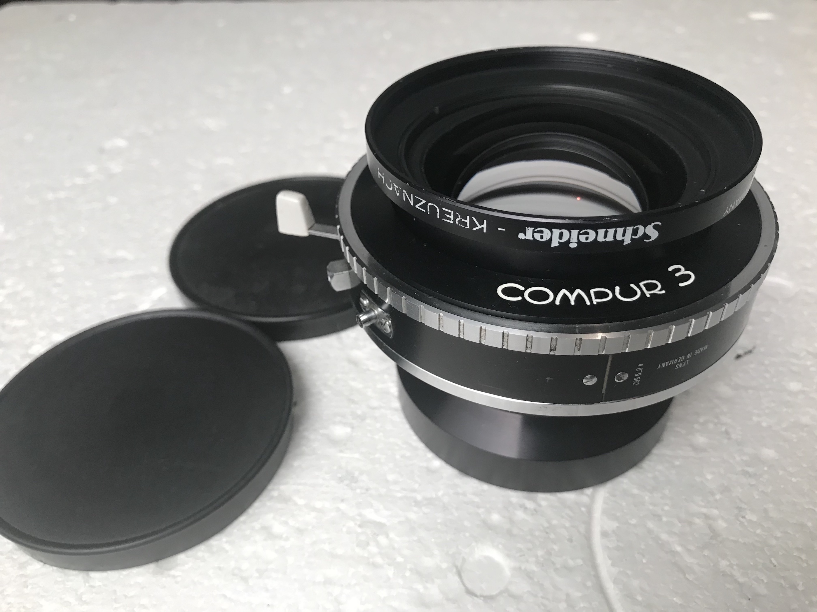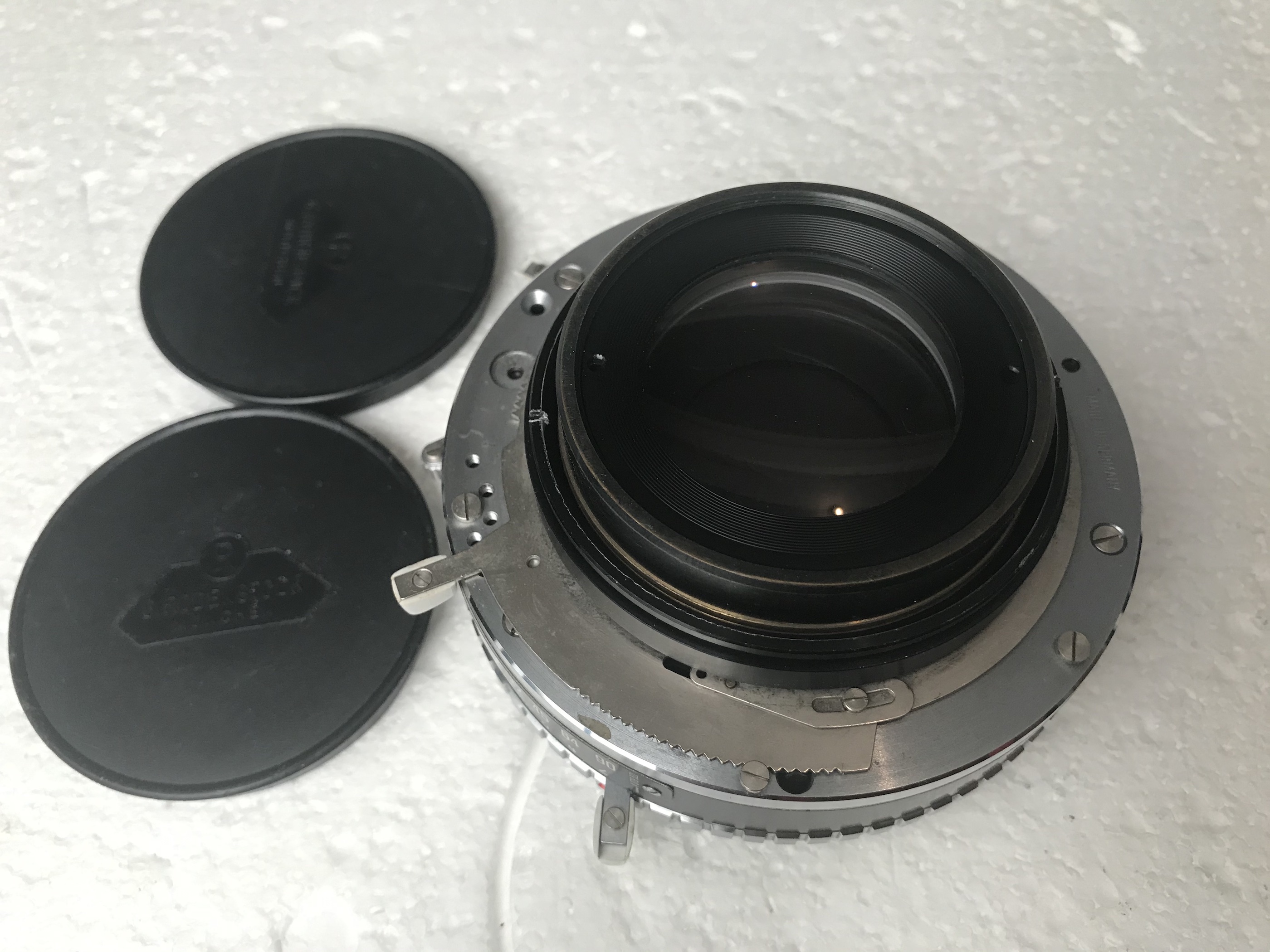 3-Schneider Apo Symmar 240mm MC in Compur 3. Very good condition except for some rubbing marks on the lettering, otherwise the glass is clear and the shutter works as it should. 2 caps. €465