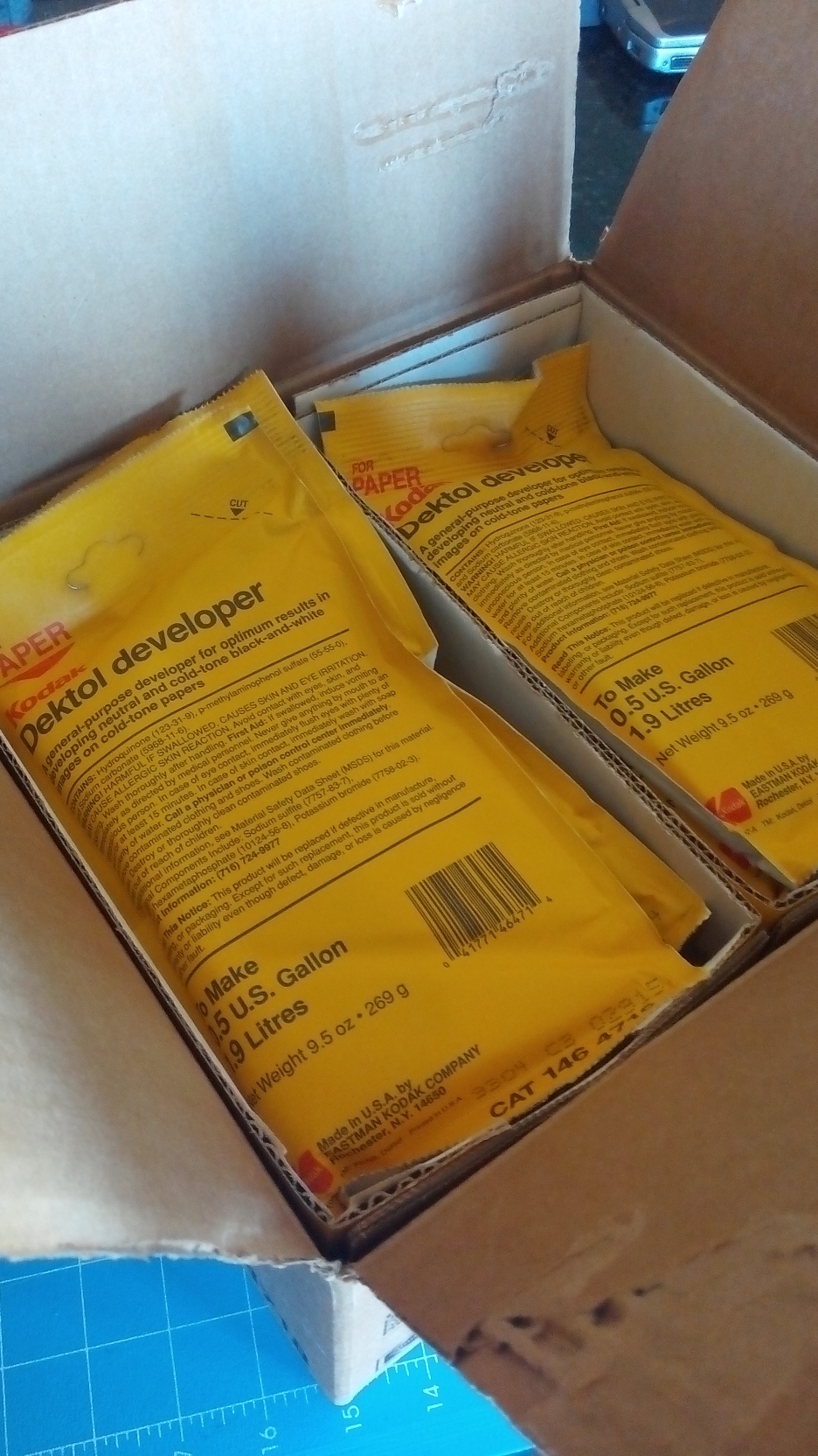 20 packs of 0.5 gal Kodak powdered dektol. I like the half gal packs since one pack more than I can use in one darkroom session and I like fresh chemistry. $3 per pack. The cheapest shipping for all 20 packs is $15 priority mail, because dektol powder is heavy.