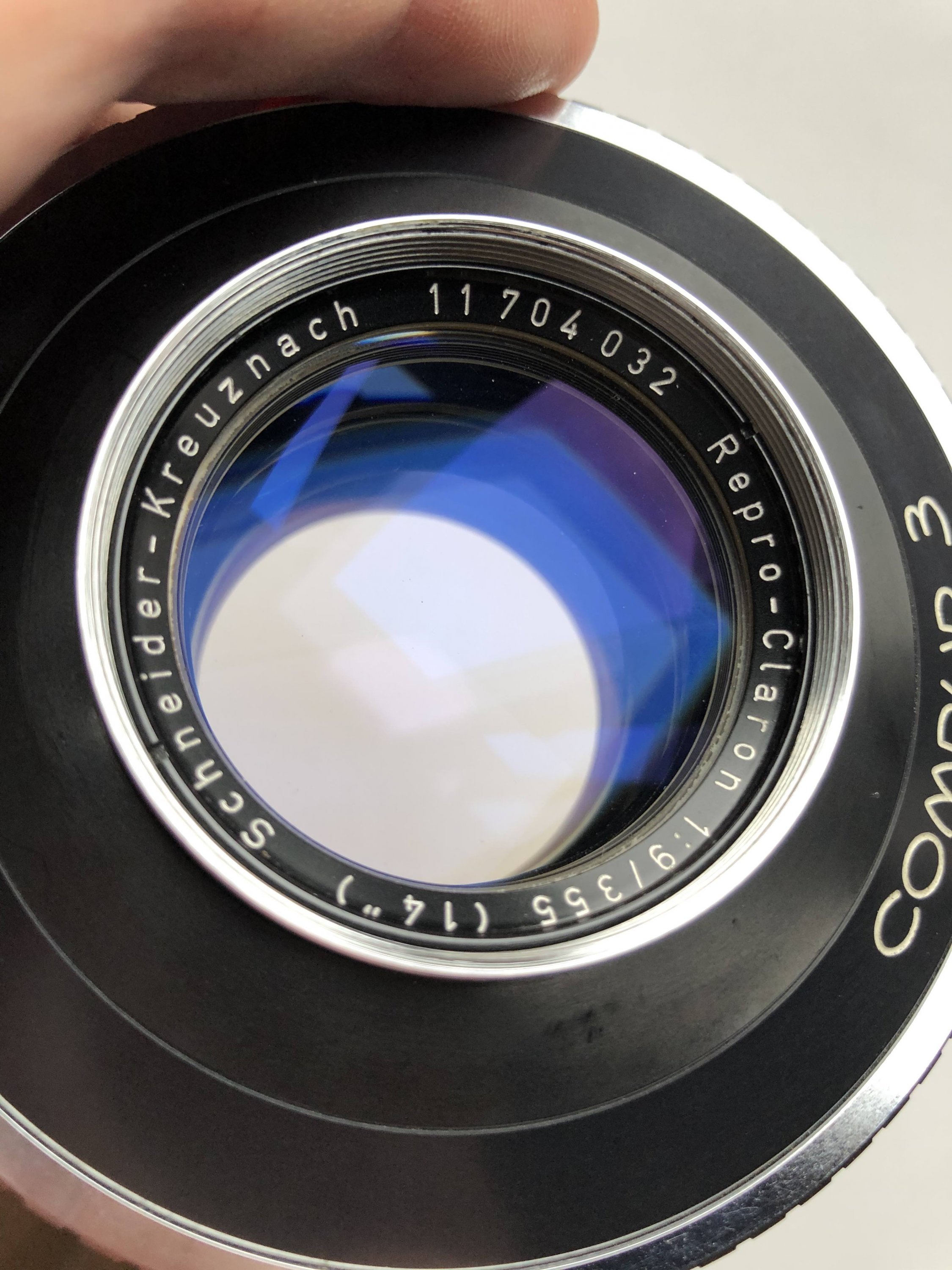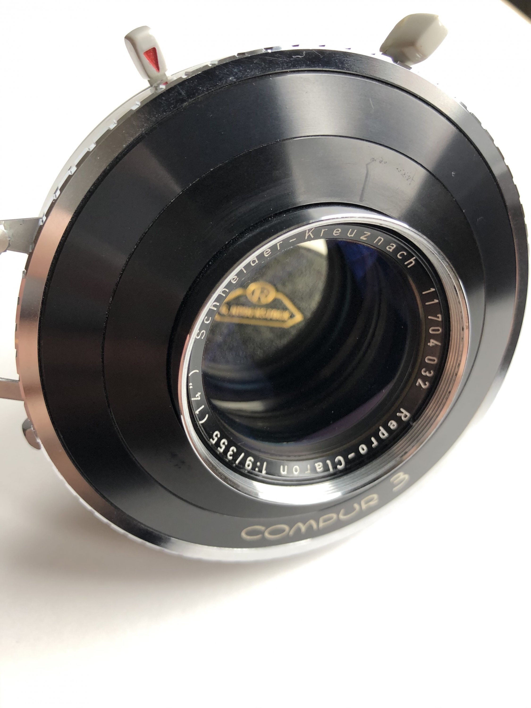 1. SOLD - Schneider Repro-Claron 355mm f/9 in Compur 3 shutter.