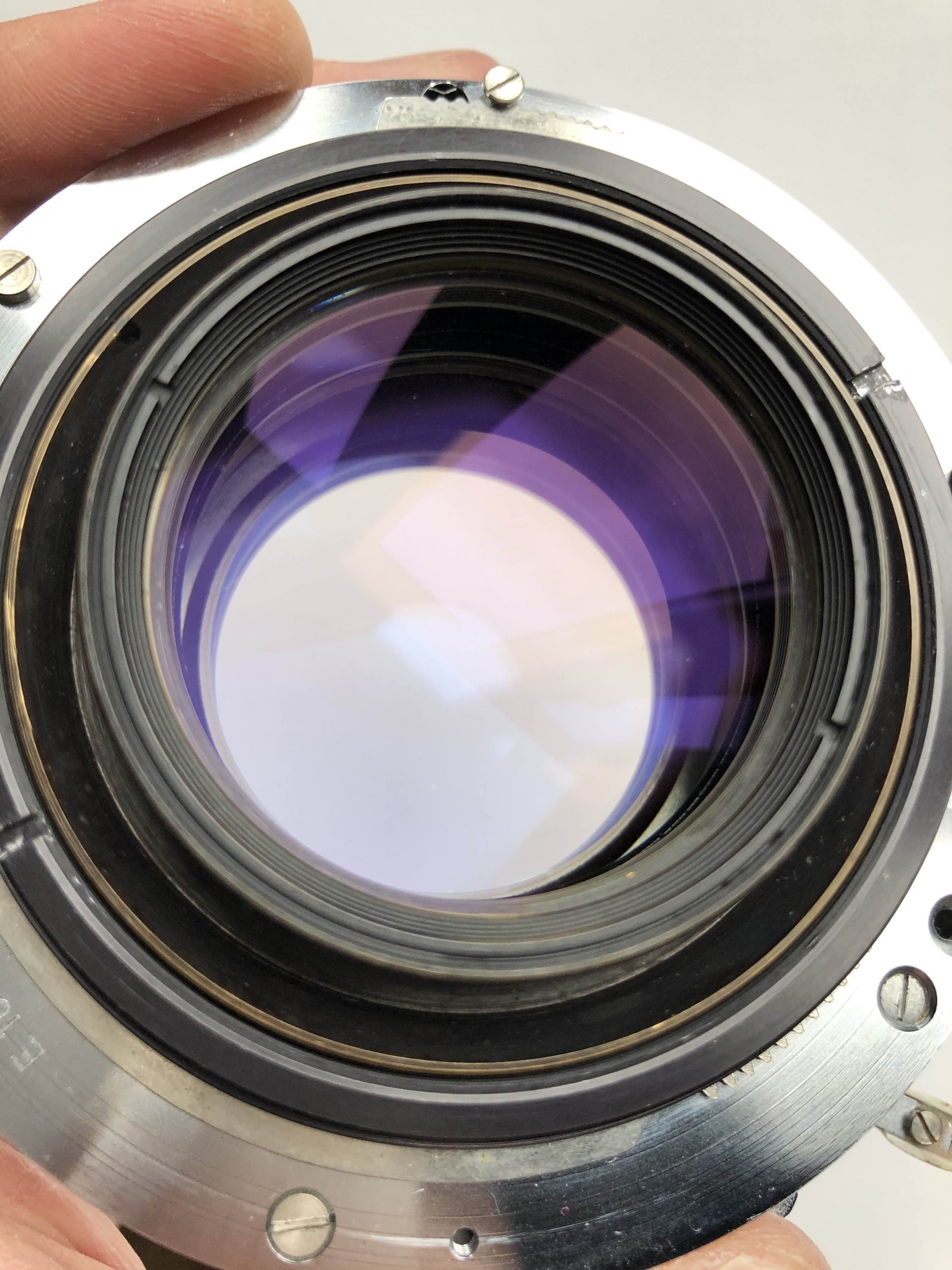 Per my knowledge, it covers 50 degrees, should be good for 8"x10" with room for movements. Actually it should cover 11"x14" at 1:10 per Goerz data. Front glass surface has many cleaning marks. Few marks on the rear element. Some dust. No other defects. Shutter works fine. Both caps and retaining ring included.