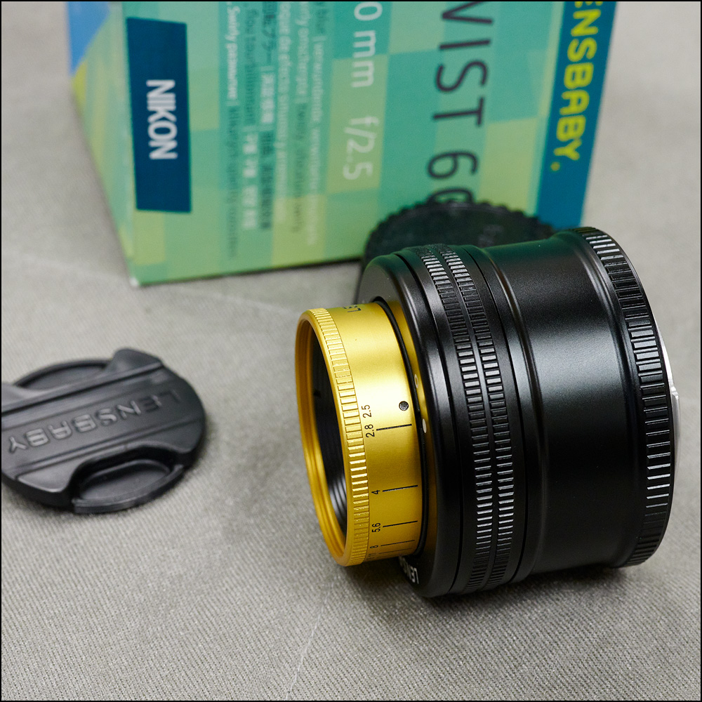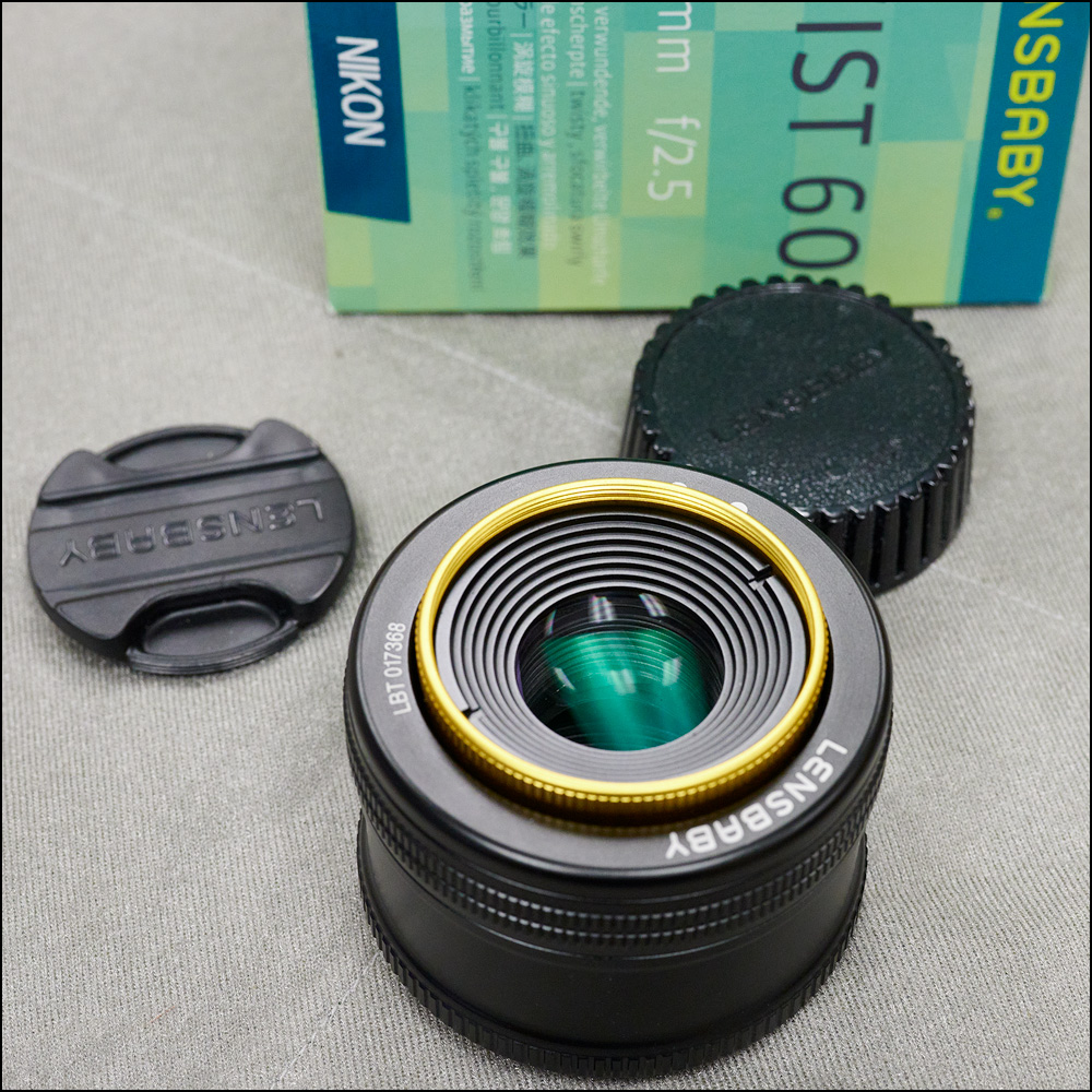 This lens is in essentially new condition. It is well suited to portraiture when you are on location with busy backgrounds. The central 2/3rds is very sharp, and then the outer 1/3rd of the background rapidly swirls creating a unique effect. The sharp central area varies with aperture, and by f8 it's virtually gone except for the extreme outer edges. I found this lens sharper centrally than the Nikon 58/1.4 G lens from f2.8 on, and of course the background swirly blur added more separation. It's also tiny and light (and cheap) by comparison, and thus easy to have in the bag for when you want the effect. Includes lens, both front and caps and box. Full details and example images here on the Lensbaby site: