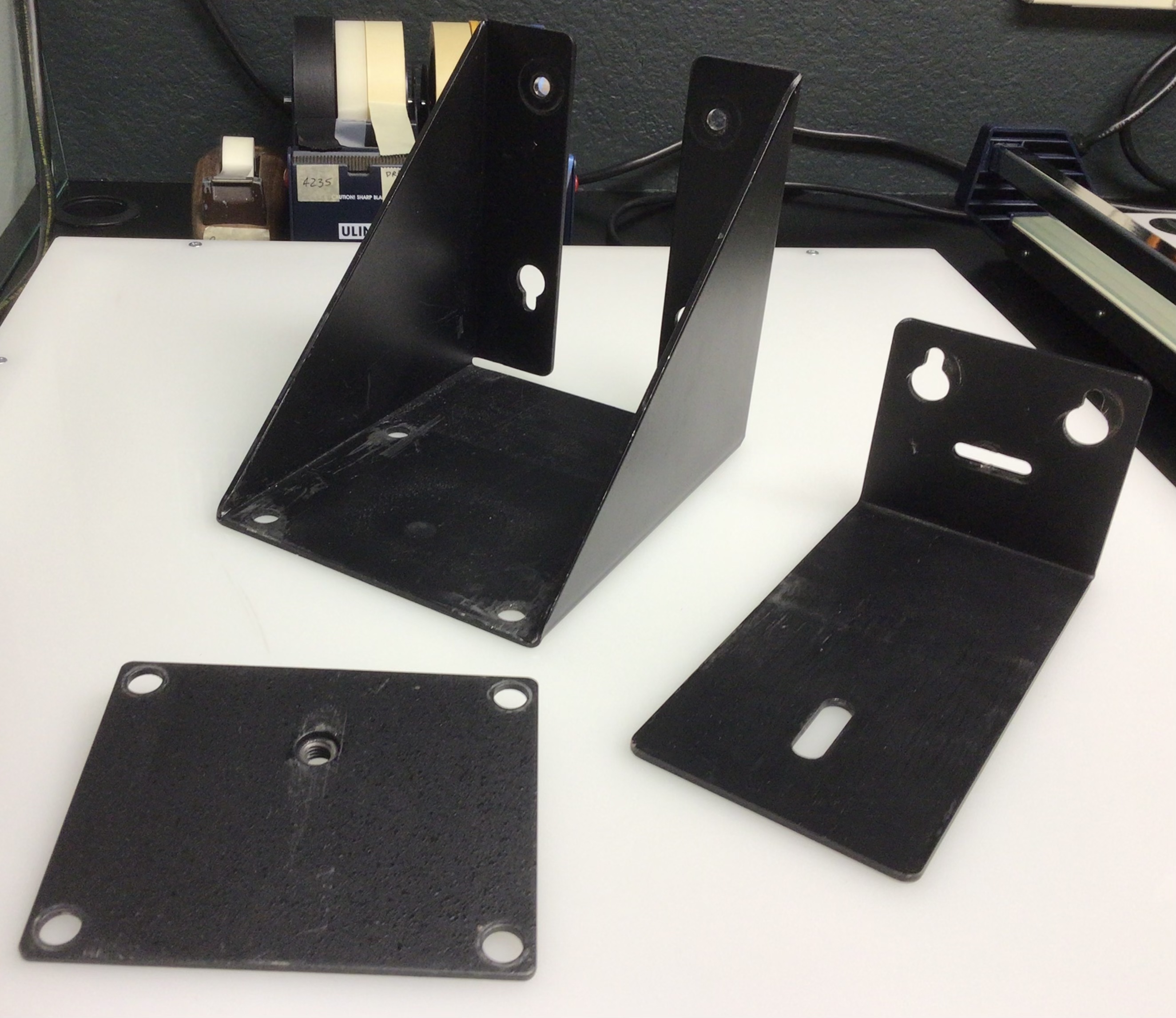 These are the components to wall mount an LPL 4x5 enlarger. Included are three brackets: the bottom L-shaped bracket, the top cap and the connector from the top of the enlarger column to the wall. Also included are the screws to attach the brackets to the enlarger column (you supply the screws to attach the brackets to the wall-lag bolts suggested).
