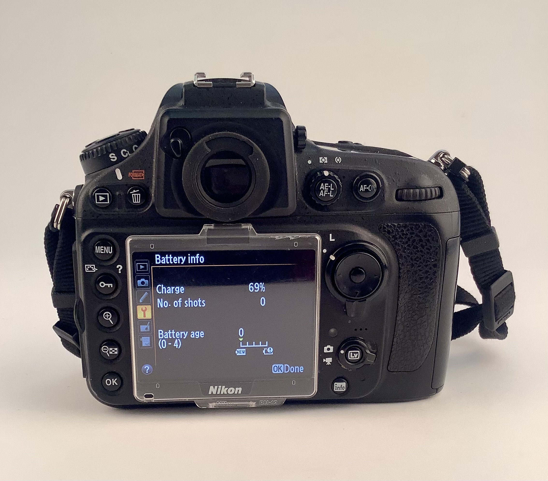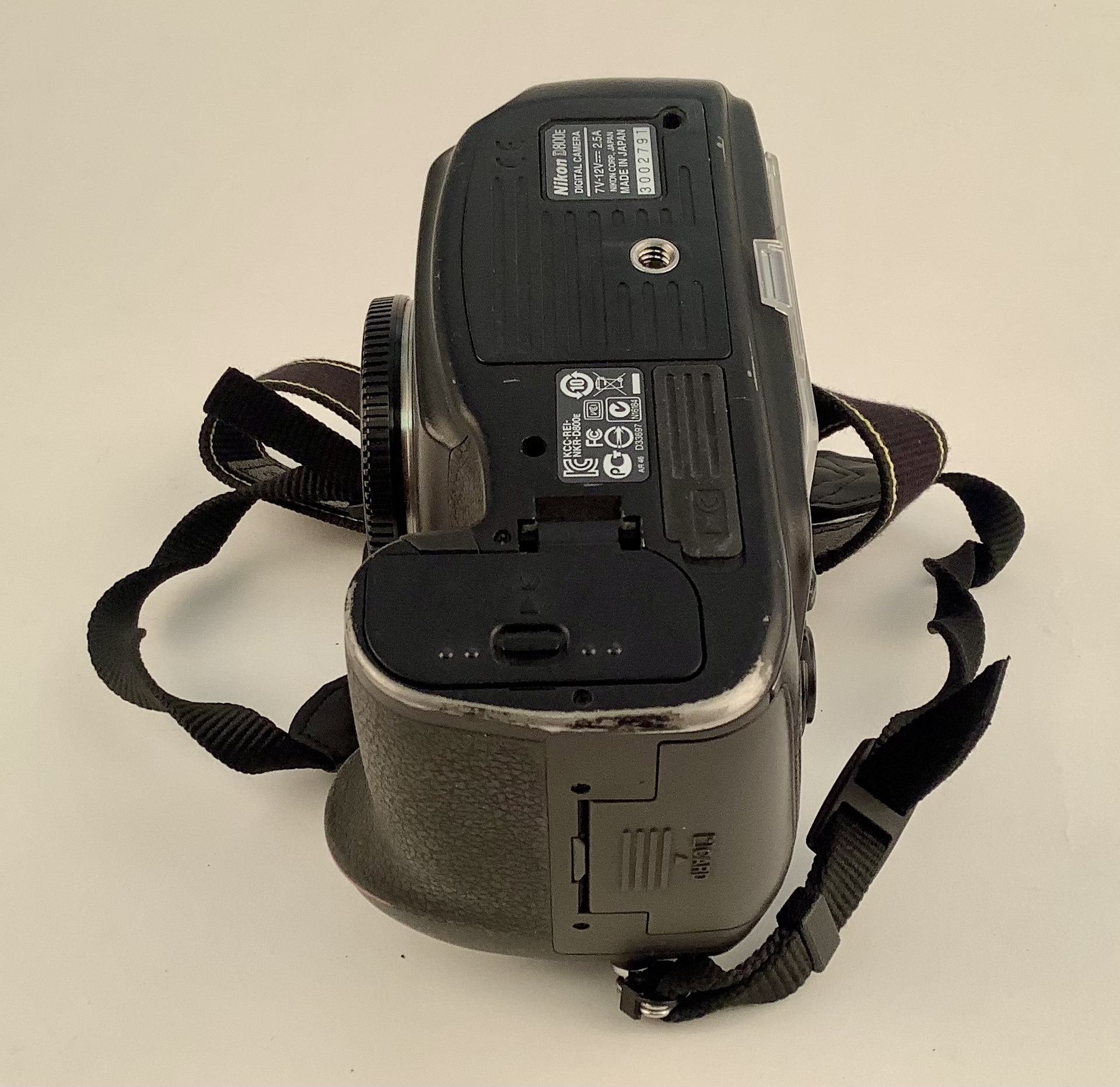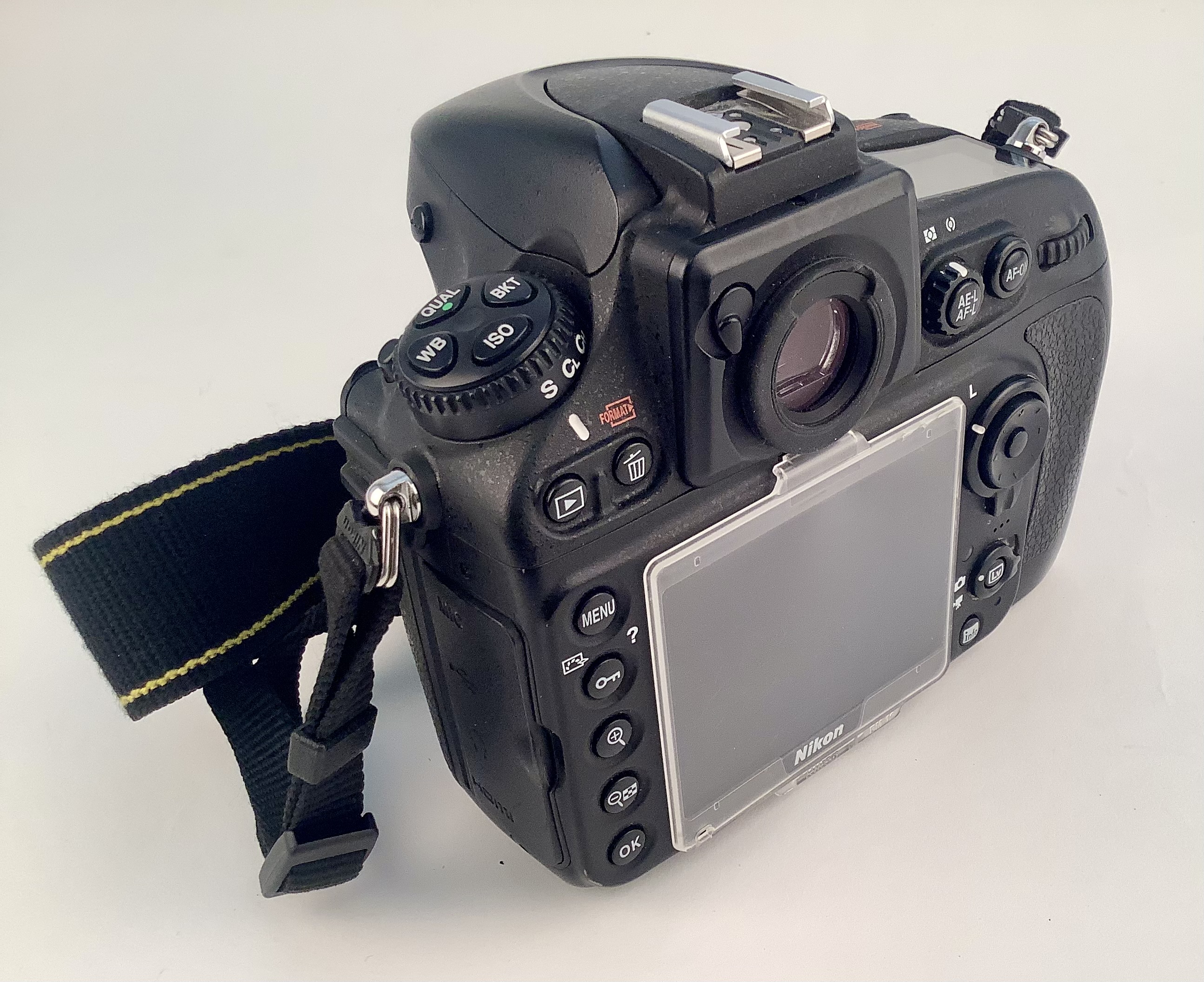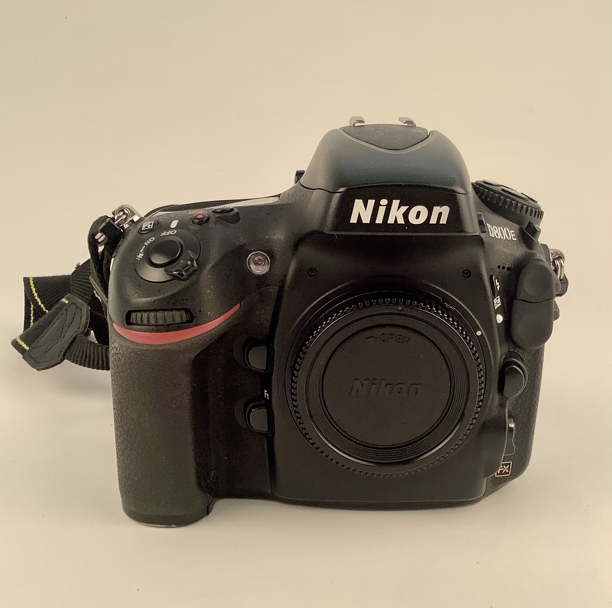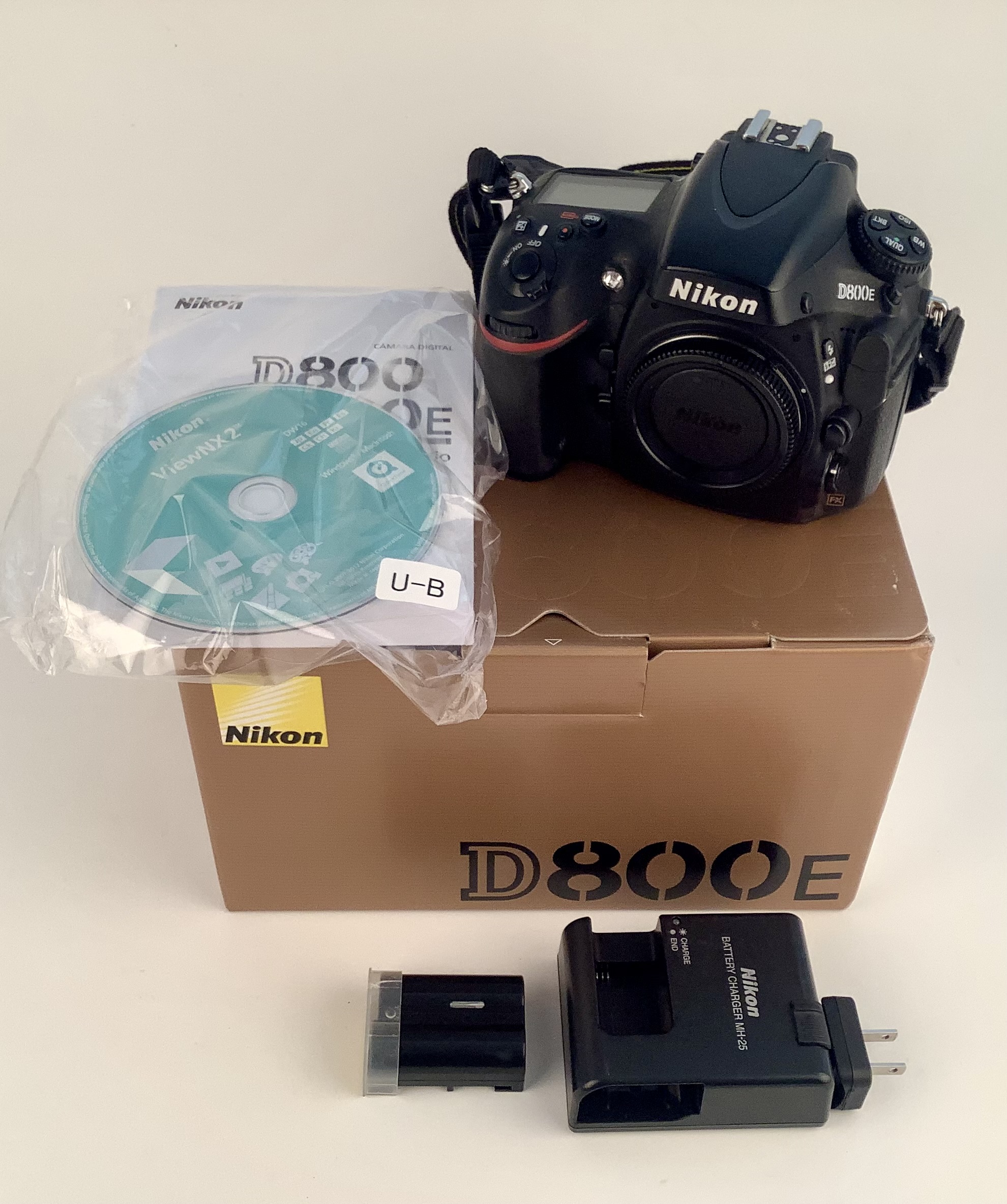 1 used Nikon D800e body with just under 16,000 shutter actuations. Come with all the stuff that would be included with a new camera plus an extra battery. Everything works good as far as I can tell. The only cosmetic issues I notice are some brassing on the bottom and the viewfinder eyepiece has a little chunk missing (see pics). Both LCD screens look good to me. $450.00 with shipping included in US. Local pickup welcome as well.