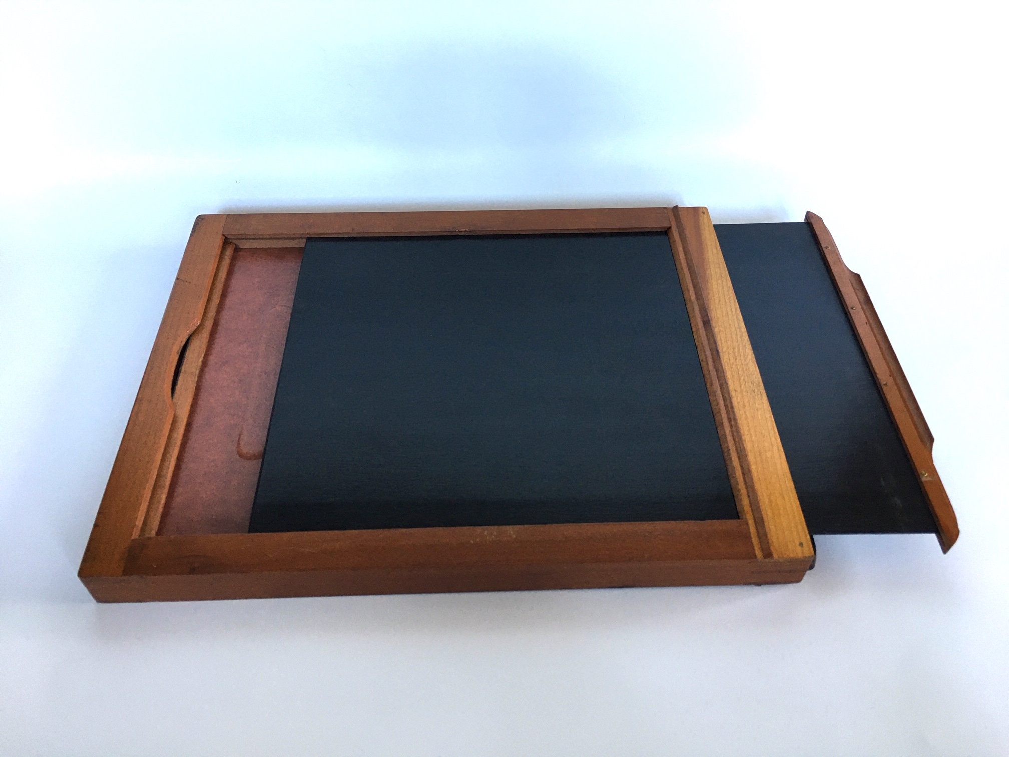 The wood and the finish are in good shape, the dark-slides move easily back and forth.