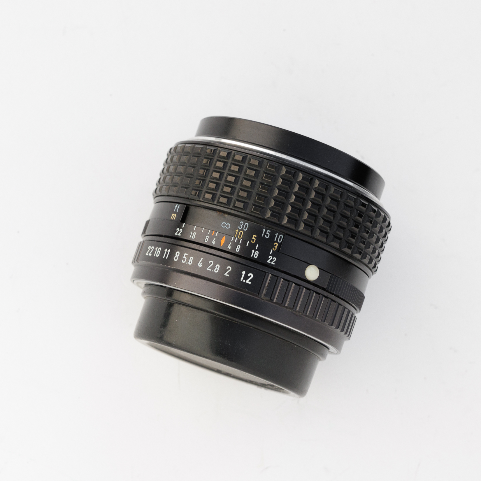 The glass on the lens is gorgeous, very clean and clear front and rear elements. There is dust on what looks like the glass just under the front element. Focus and aperture rings move smooth and even and the blades look clean as well. Comes with a Pentax rear cap and a non Pentax front cap.