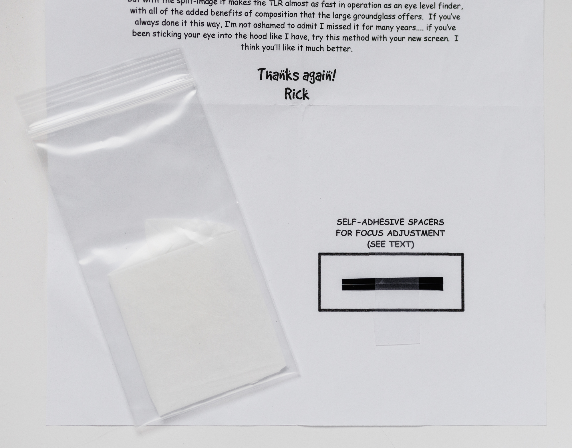 This is a screen for Rolleis that did NOT have a removable waist level finder. It was installed in a camera but I ended up getting a different Rollei so I pulled it out. Comes as new, I did not need the spacers that he included.