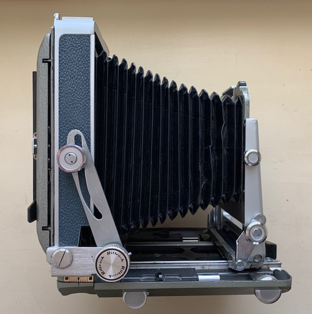 Selling my Rittreck View with 5 X 7 back in good condition. Bellows are light tight and and are supple. All movements work properly and lock down tightly. Comes with a user manual in English and 3 lens boards in Copal 3 and Copal 1 and one undrilled recessed lens board (not shown). 5 X 7 back opens and closes smoothly and ground glass is in good shape. The 4 X 5 revolving back has a Graflok type back which I understand was only available on the later models and quite hard to come across - most I have seen are spring backs. I used it with a Grafmatic and a 6 x 12 roll film back and a Graflex 6 X 9 roll film back. Ground glass in good shape with a fresnel. New seals on 5 x 7 and 4 x 5 back.
