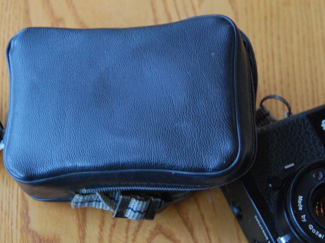 This is the other item my friend asked me to sell following her father's passing. It's a nice Rollei XF35 with its original case an non-original strap. This used a PX625 mercury battery, but can be used with a 625-size Wein cell. The camera is pretty clean; the viewfinder is clear and seems accurate with around-the-house focus testing. The glass looks clean and clear. You can see a bit of dirt on the front around the base of the lens that I missed in my original cleaning, it's now gone (cotton swabs slightly moistened with distilled water do wonders!). I just noticed that the back is not properly latched in the fifth photo, that was simple carelessness on my part and the latch does in fact work correctly. I removed the battery compartment cover for photo purposes to show that the interior is clean, it's been reinstalled. The notch on that cover is little banged up, but usable with a quarter. There's no lens cap, but the case is pretty nice. My friend said this camera never got much use, her dad just liked his toys...